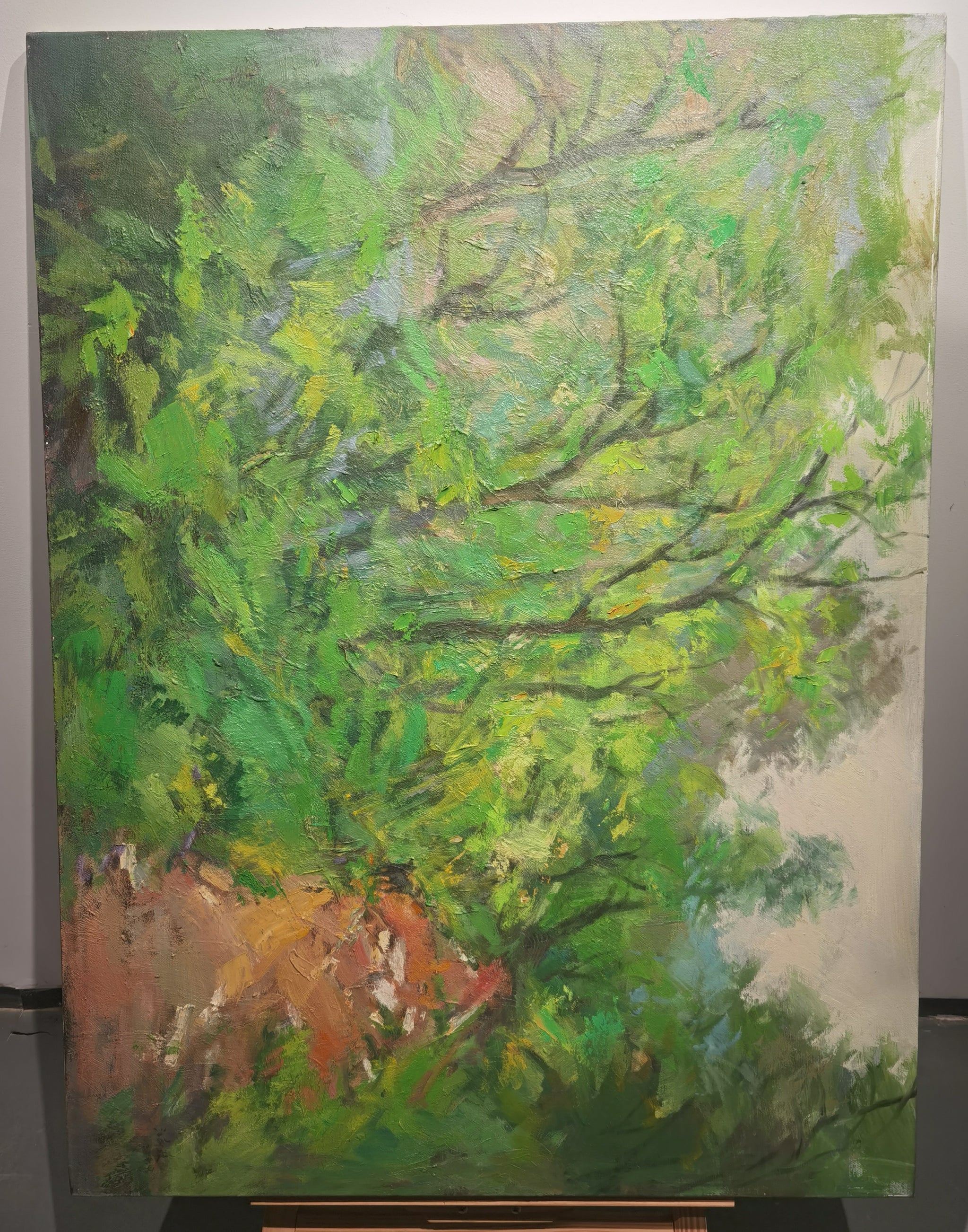 Executed in oil on canvas, the work embodies impressionistic tendencies with its loose brushwork and atmospheric rendering. Jiang demonstrates an affinity for nature’s fleeting moods, layering tones of green, ochre, and sienna to evoke dappled light and undergrowth. His approach draws influence from both Western plein-air traditions and Chinese landscape aesthetics, creating a cross-cultural visual language.