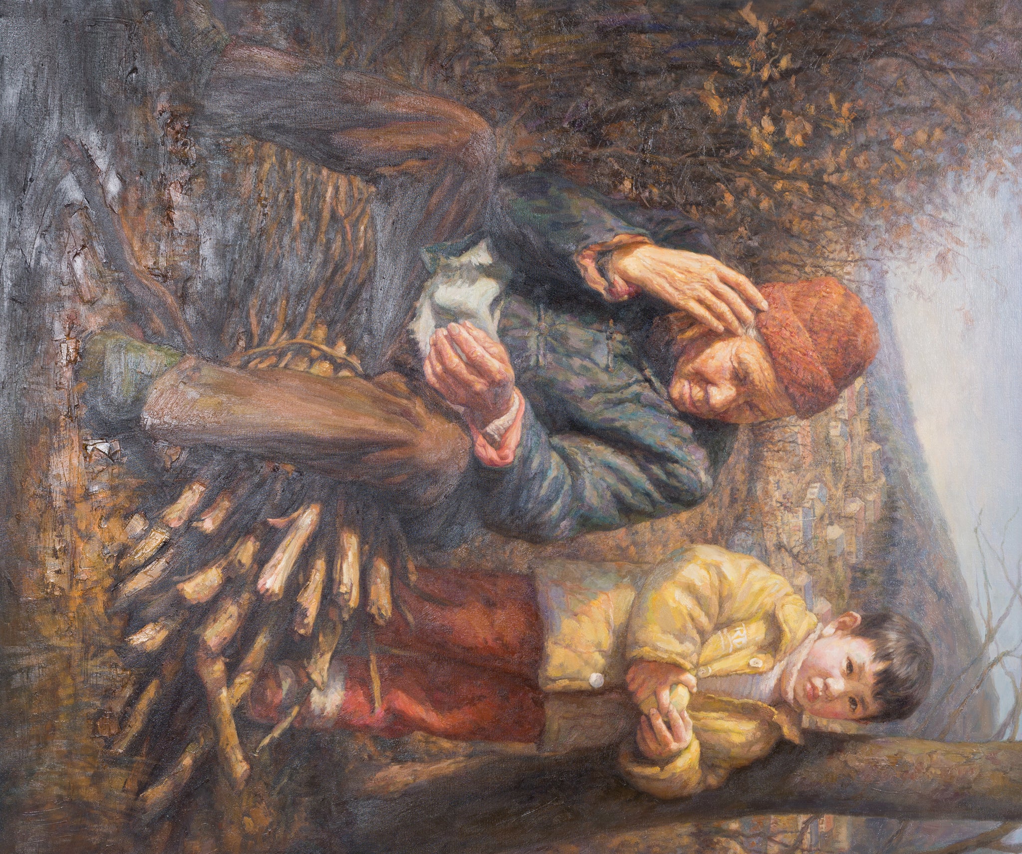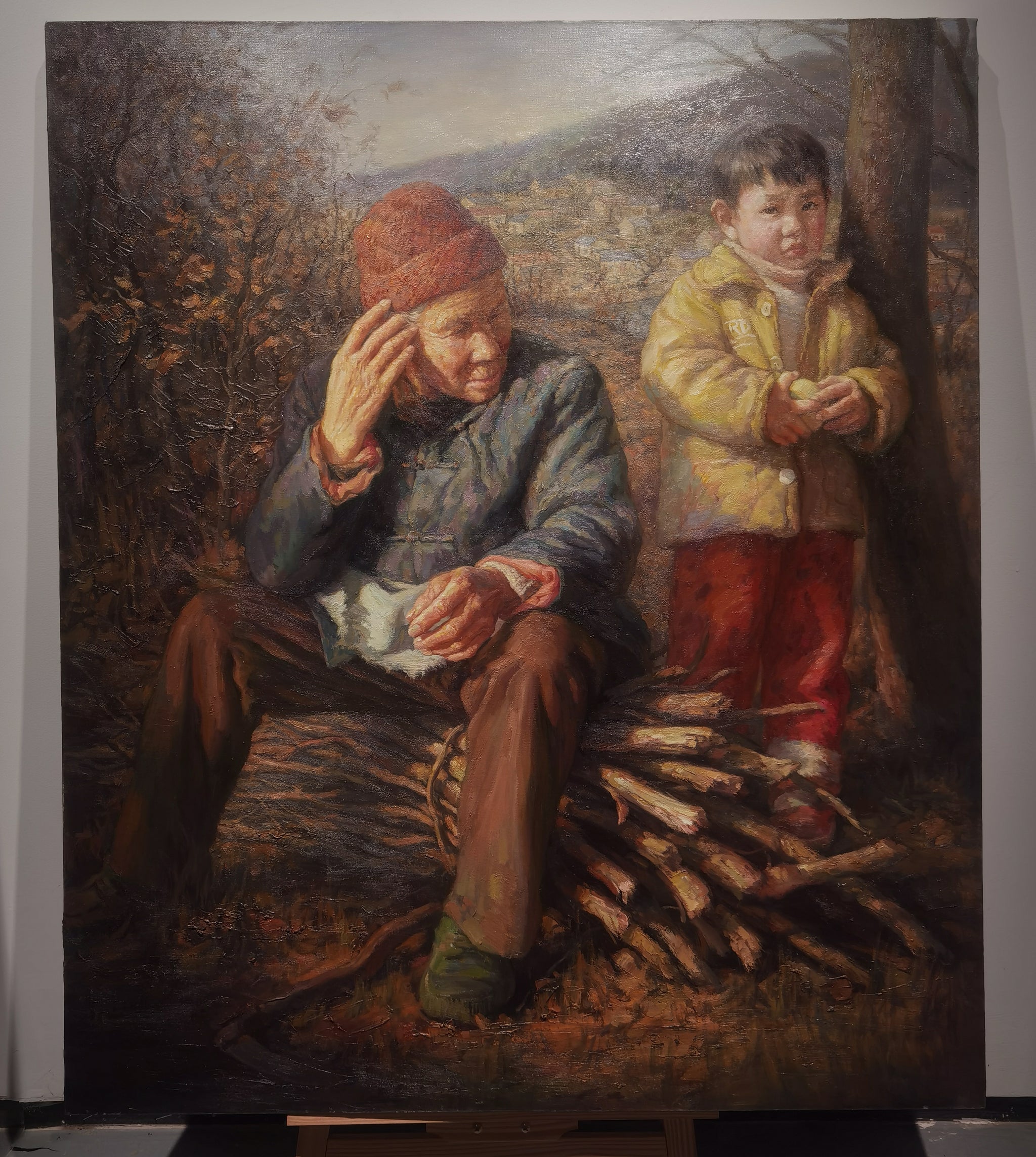 In this evocative oil on canvas Title:d The Story of Chai Wo, Xinlin Jiang presents a tender intergenerational portrait set against a muted winter landscape. The composition centers on an elderly villager seated upon a bundle of firewood, his hand raised in thoughtful gesture, while a young child stands beside him, gazing outward with solemn curiosity. The figures are rendered with tactile realism and subtle emotional depth, reinforcing the artist’s commitment to portraying rural life with authenticity and quiet reverence.