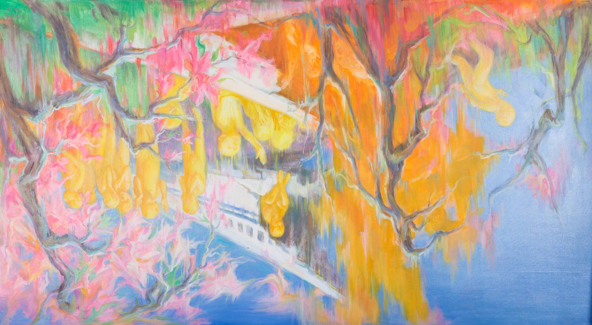 In The Peach Blossom of the Passing Scenery of the Third, Xinlin Jiang presents a fantastical and emotive composition rendered in luminous oil on canvas. This 100 x 180 cm panoramic painting features glowing golden figures emerging among cherry-blossom-like trees and flame-hued surroundings, set against a surreal architectural backdrop resembling a modern structure in disrepair. The swirling energy of color and form amplifies the emotional tension within the narrative.