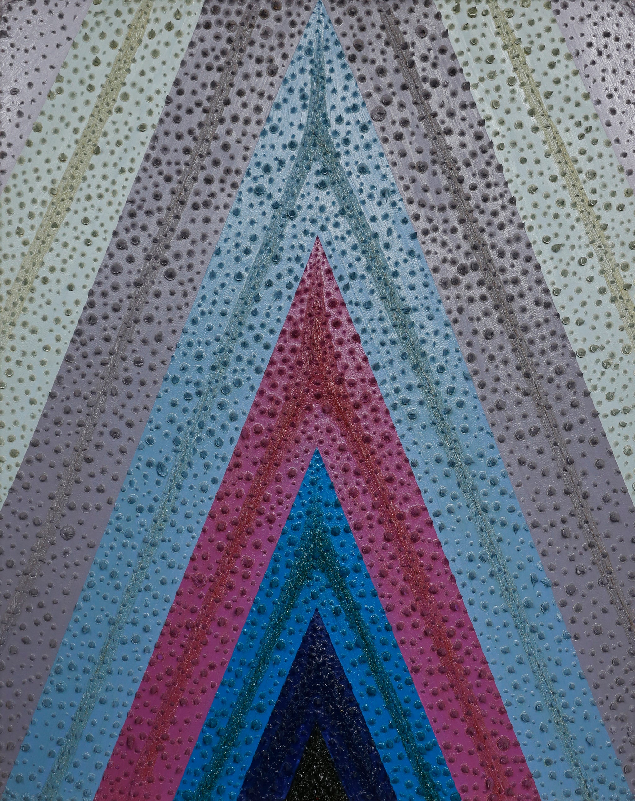 “Tsuki 1” by Guozhi Tang presents a mesmerizing composition of ascending chevron forms, rendered in muted gradients of blues, purples, and greys. The rhythmic geometry is enhanced by the artist’s signature use of dense surface textures, creating a tactile experience that blurs the line between painting and relief.