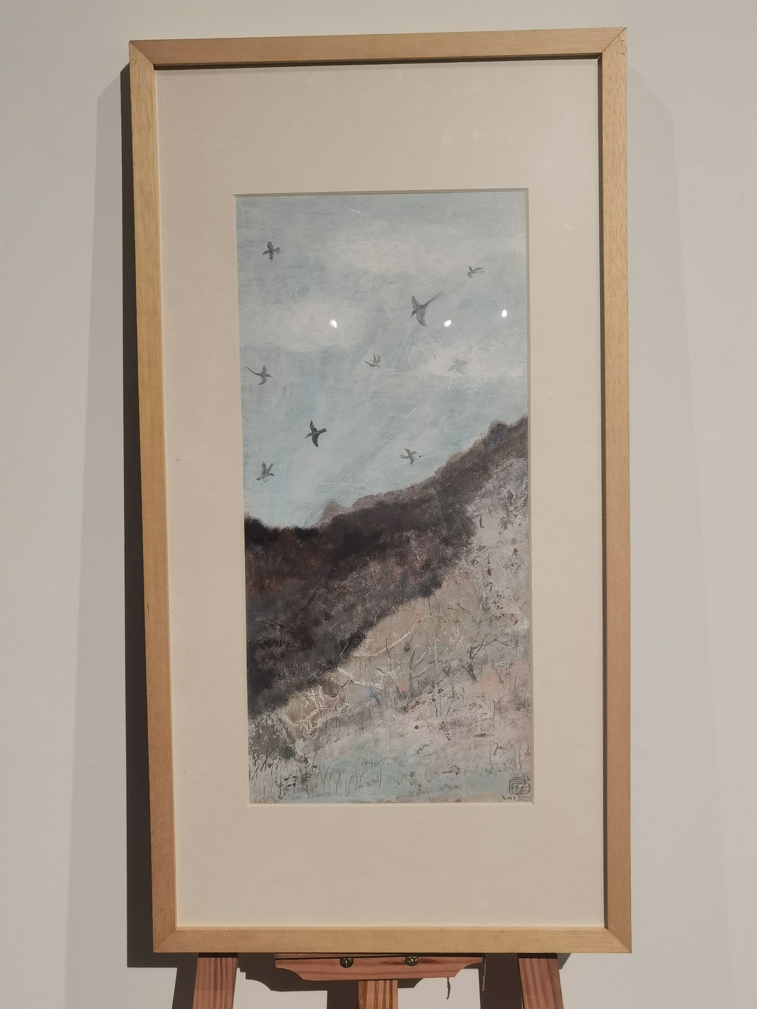 Huang’s technique blends the sensitivity of traditional Chinese ink landscapes with Western atmospheric abstraction. The use of acrylic achieves both density and translucence, enabling subtle textures across the earth and air. This fusion of Eastern aesthetic minimalism and Western Romanticism situates his work in a transcultural dialogue on space, silence, and memory. The birds, drawn with sparing detail, recall classical motifs of nature and freedom.
