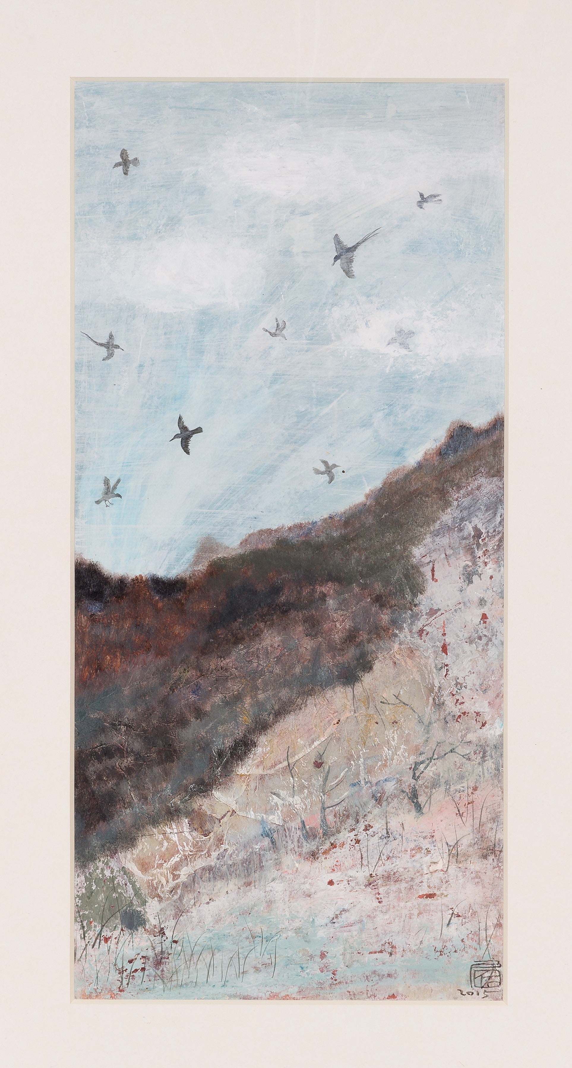 In Birds Hunt for Food, Qiyou Huang captures a tranquil winter hillside under a pale sky, animated by a graceful flock of birds in mid-flight. The landscape, rendered in soft earthy and icy hues, evokes a sense of stillness and poetic solitude, while the birds introduce a delicate sense of motion and life. The work is a vertical format piece that accentuates the sweeping ascent of the hill and sky, guiding the viewer's gaze from grounded brush through to open atmosphere.