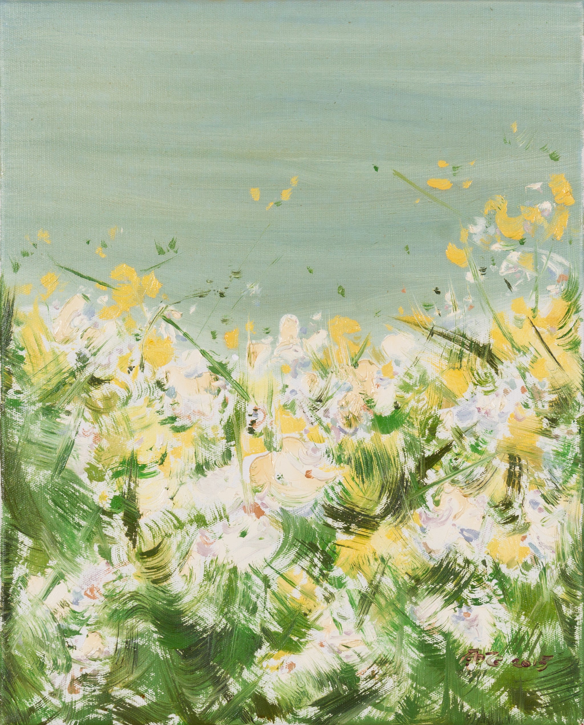 Cherry Blossoms 2 Fragrance by Yufei Ning is an oil on canvas that captures the fleeting delicacy of wildflowers in bloom, rendered with gestural exuberance and chromatic softness. The painting presents a flurry of yellow, green, and white blossoms that rise from the lower register and dissolve into a pale, breezy sky. Measuring 50 by 40 centimeters, this composition exemplifies Ning’s light-drenched and highly tactile technique.