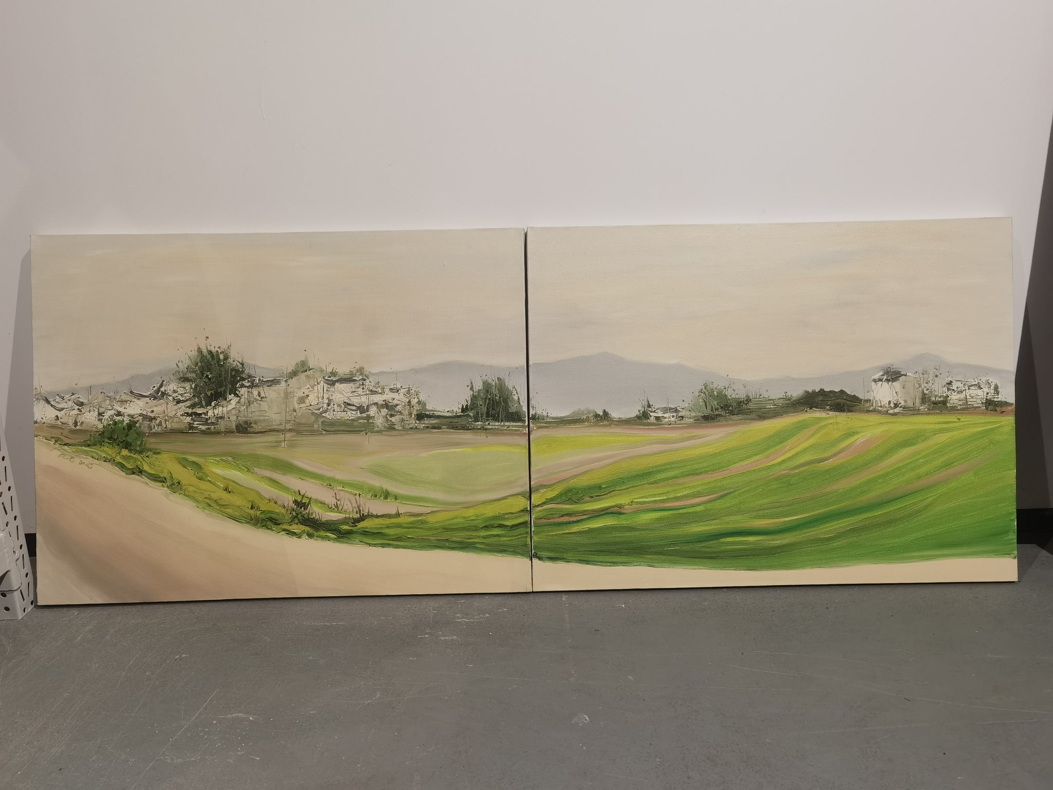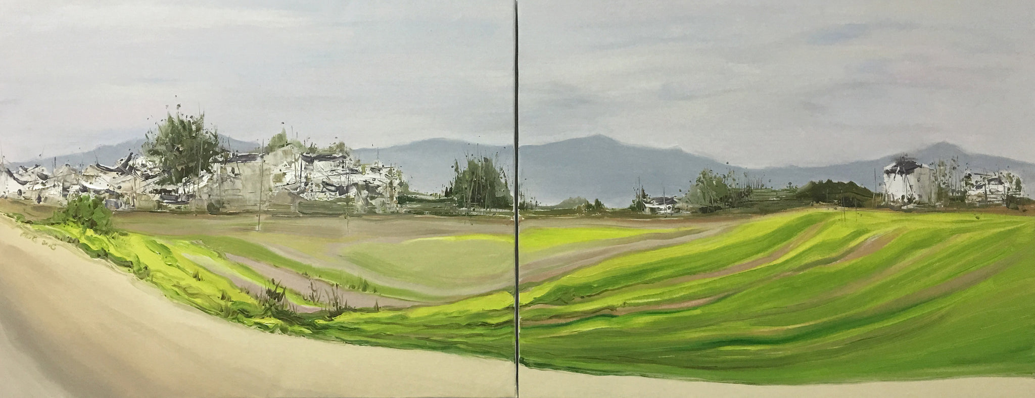 Pingshan Village East is a serene diptych by Chinese artist Yufei Ning, comprising two oil-on-canvas panels that together form a sweeping pastoral view. The composition captures the gentle undulation of verdant fields under a pale sky, with a cluster of traditional white-walled village buildings nestled at the base of distant misty mountains. The panels combine to create a harmonious horizontal vista, inviting a slow, immersive gaze.