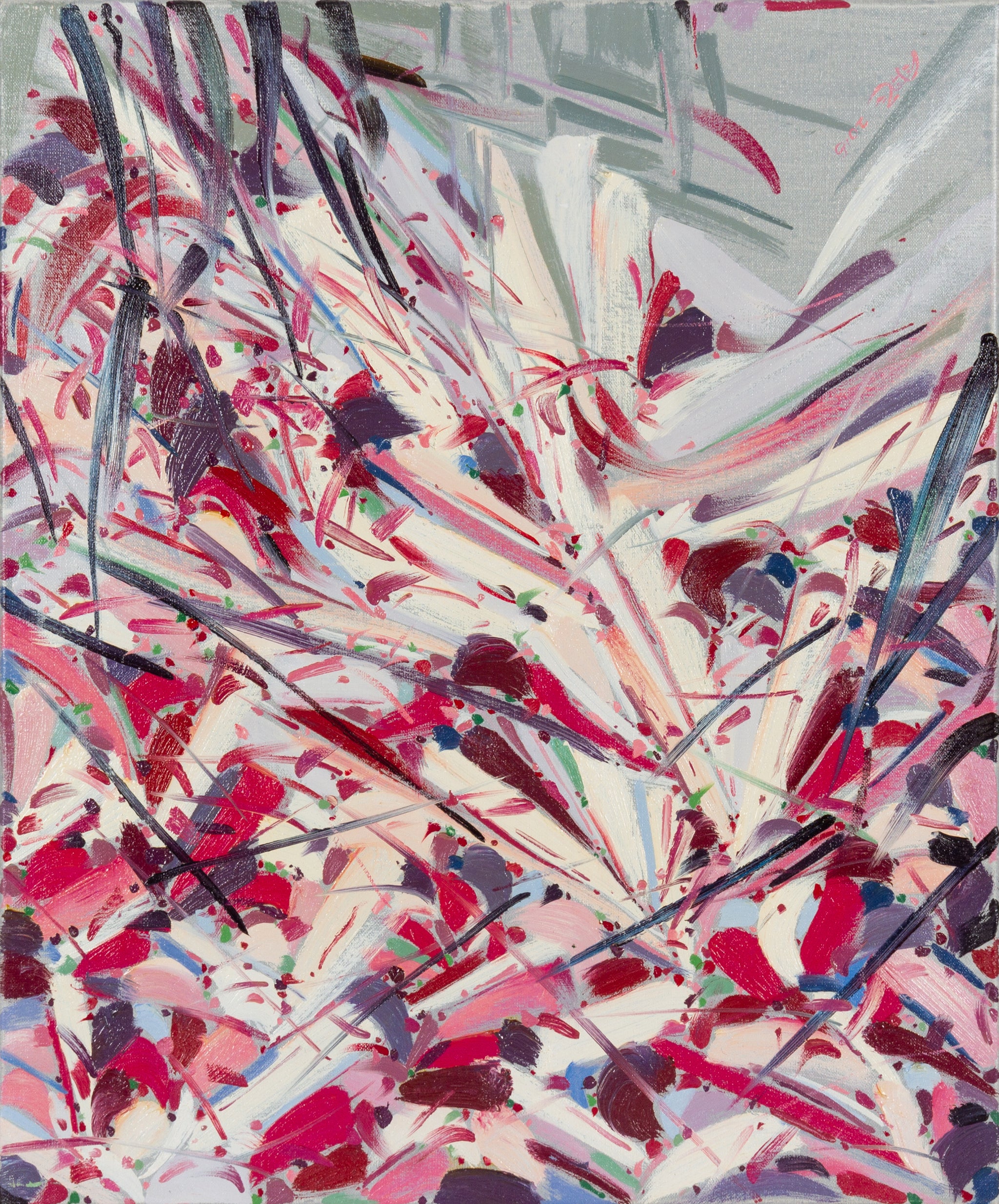 Painted in 2015, this piece emerged during a period when Ning increasingly explored botanical abstraction as a metaphor for sensory overload and transient beauty. Cherry blossoms—iconic symbols of renewal and impermanence in East Asian culture—become here not merely motifs but atmospheric agents, dissolving the boundary between figuration and sensation.