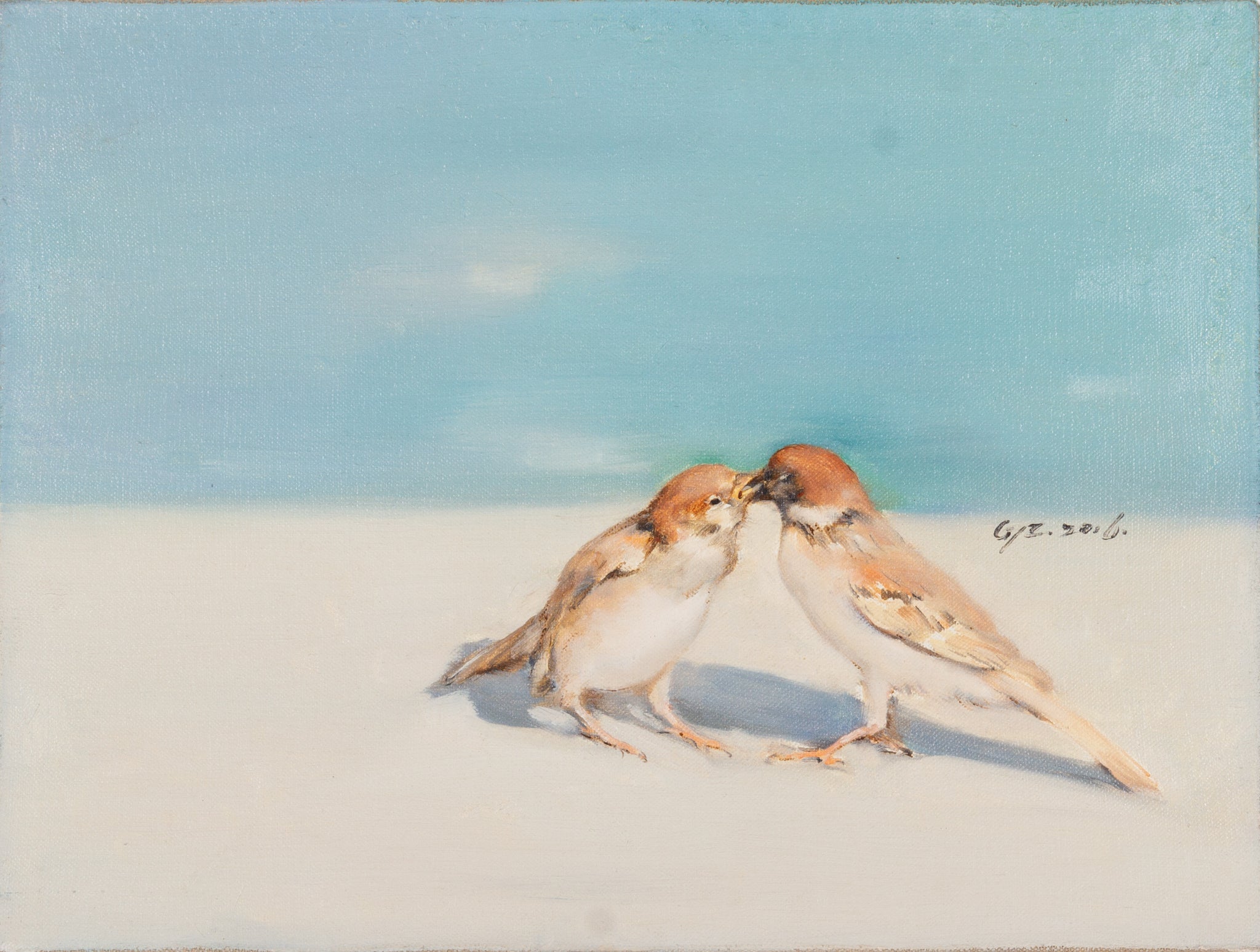Love 3 is part of Guoyong Zhang's poignant Sparrow Series, painted in 2016. The work features two delicately rendered sparrows nuzzling affectionately against a luminous background of pale sky and soft light. The composition is minimal and intimate, capturing a tender moment of avian interaction, suggestive of care and quiet companionship.