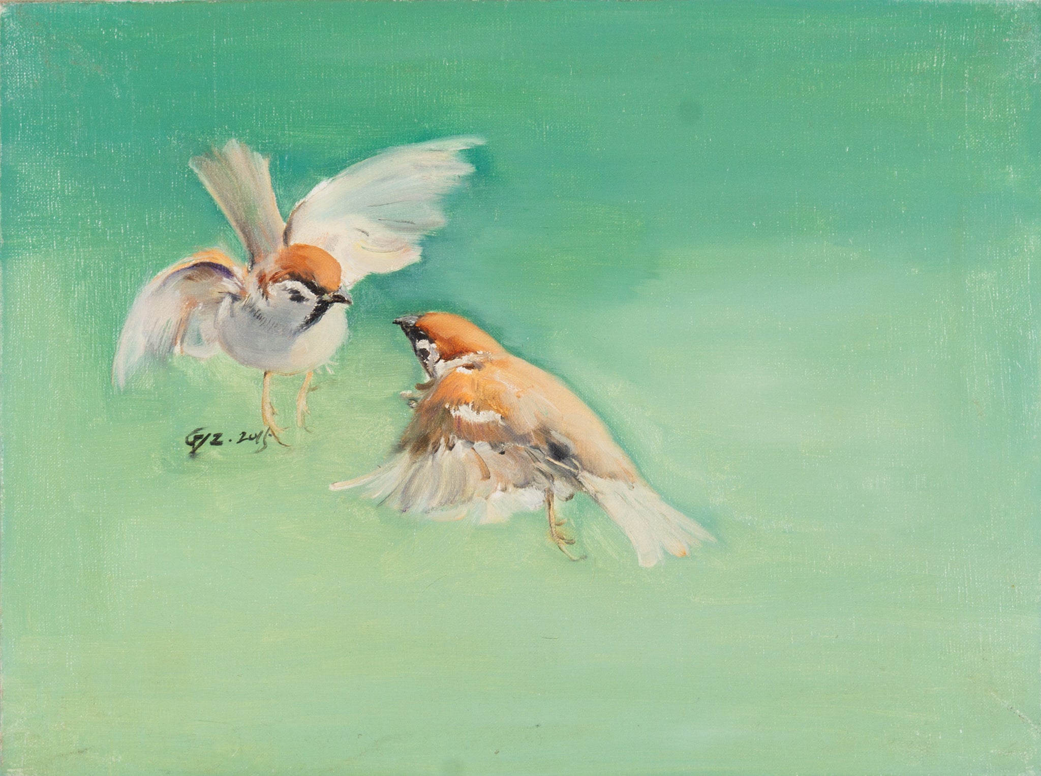 Guoyong Zhang’s The Flight of the Finch (2015) presents a dynamic interaction between two sparrows, caught mid-movement against a vibrant, green-toned backdrop. Rendered in oil on canvas, this small-format painting captures a fleeting instant—one bird airborne, wings extended, while the other remains grounded—imbuing the composition with both narrative tension and poetic restraint. The smooth surface and controlled brushwork enhance the expressive realism of the birds’ plumage and gesture.