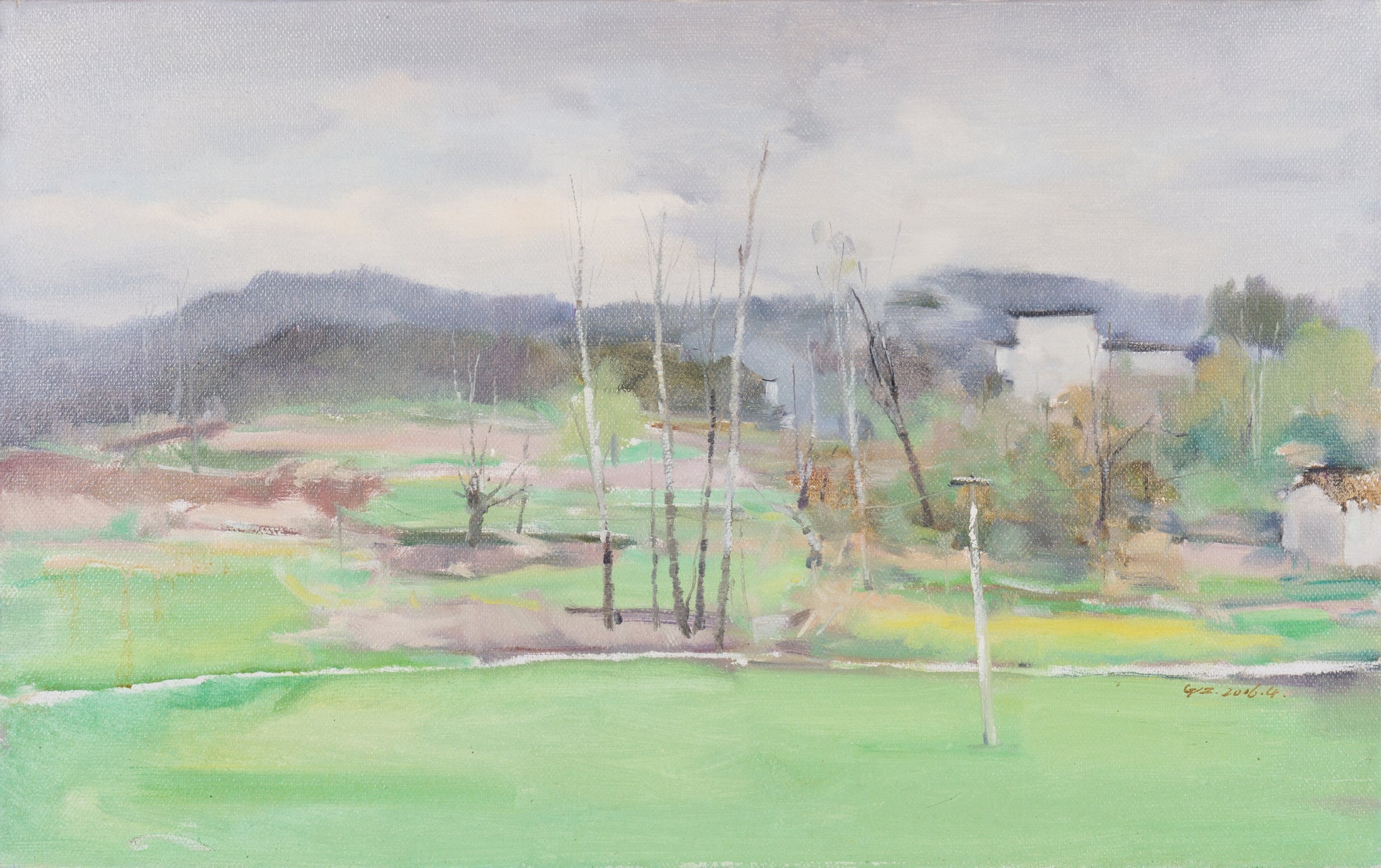 Guoyong Zhang’s The Misty Rain Is Abundant in Huizhou's Spring is a delicately rendered oil painting that captures a fleeting moment of pastoral tranquility. Set against a backdrop of mist-veiled hills and traditional Huizhou architecture, the composition features soft fields, sparse trees, and filtered light, all unified by a gentle, almost ethereal color palette. The artist’s nuanced brushwork and refined tonal transitions lend the work a poetic sense of temporality.