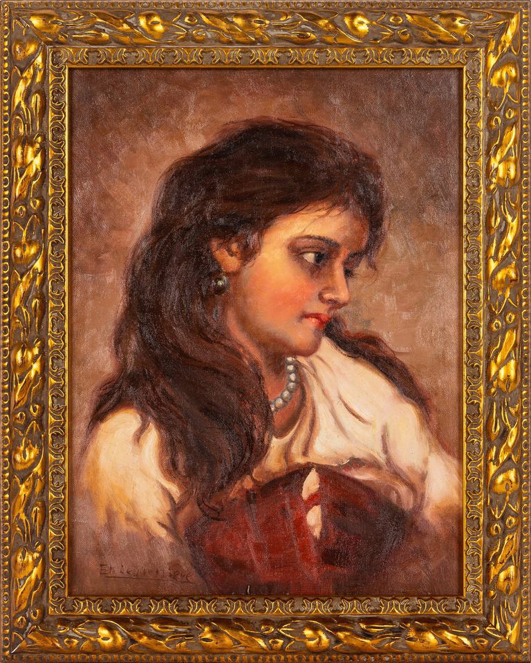 This exquisite portrait by Eugène Anatole Carrière captures the delicate beauty of a young woman, rendered in the artist’s signature soft and expressive brushwork. The subject’s contemplative gaze and the warm, muted tones evoke a dreamlike atmosphere, characteristic of Carrière’s Symbolist approach. Her flowing dark hair, adorned with pearl jewelry, and the subtle interplay of light and shadow add to the painting’s intimate allure. Housed in an ornate gilded frame, this piece is a testament to Carrière’s masterful ability to blend realism with an almost ethereal quality.