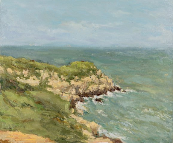 East Pole Island Sea View is a captivating oil painting by Dingyi Sun, depicting a rugged coastline where dramatic cliffs meet the tranquil ocean beneath a clear sky. The vantage point suggests a clifftop perspective, offering a panoramic view of the natural seascape rendered with expressive brushstrokes that emphasize texture and light.