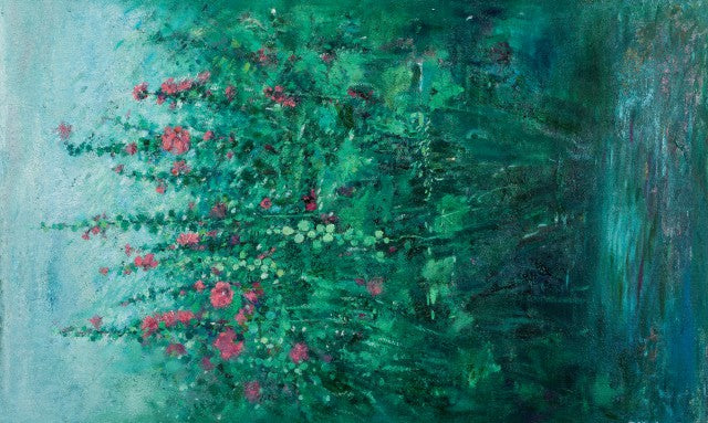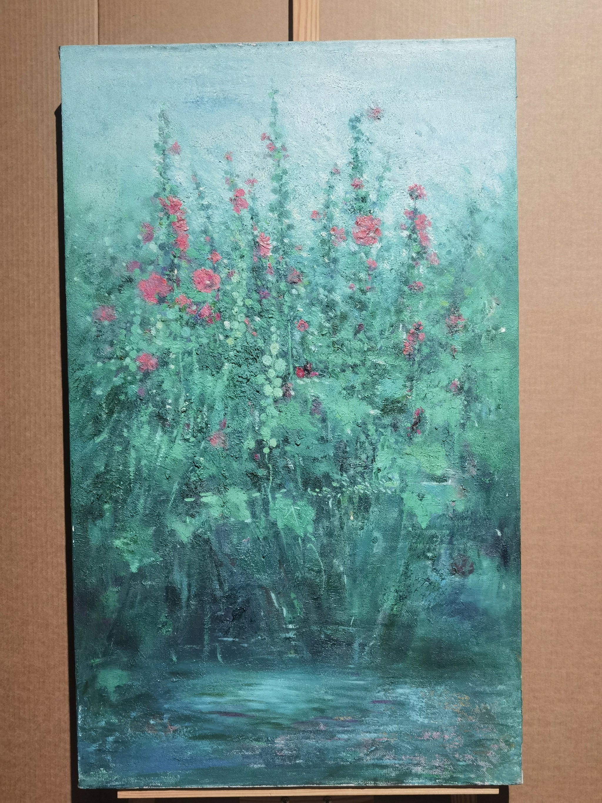 Nameless by Zhaoqiang Zhu is an exuberant oil painting that captures the vivid beauty of hollyhocks in full bloom. Rendered on a horizontal canvas, the composition emphasizes vertical floral forms that rise gracefully against a textured backdrop. Lush chromatic interplay of pinks, reds, and greens conveys both vitality and elegance, inviting viewers into an intimate encounter with nature’s ornamental grandeur.
