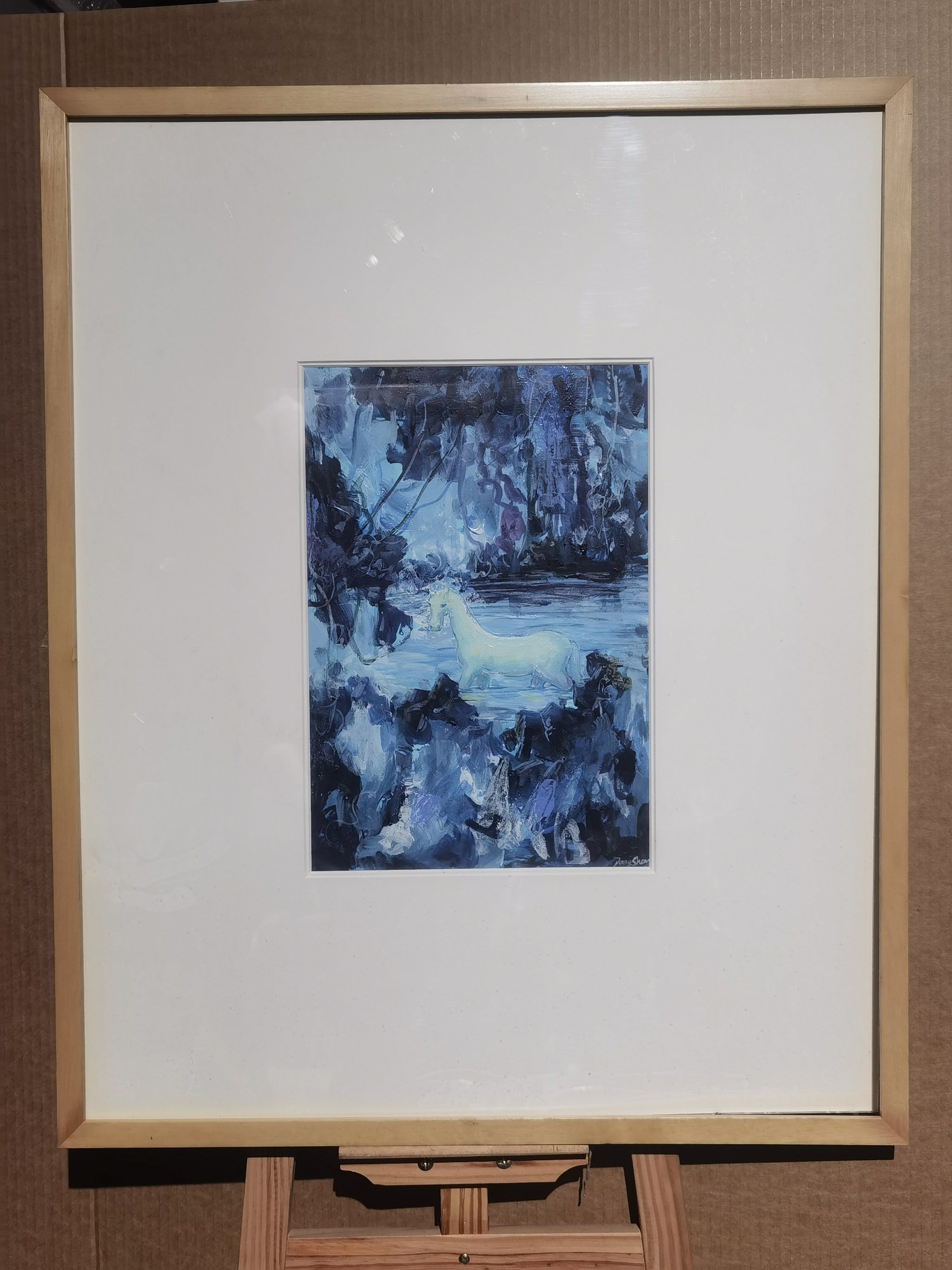 The Horse by Dongsheng Zhu is a captivating small-scale acrylic work depicting a white horse standing in a mystical, forested waterscape. The composition is awash in layered tones of blue, violet, and indigo, surrounding the luminous horse at the center with an ethereal, almost enchanted atmosphere. The paint application is expressive and fluid, enhancing the dreamlike quality of the scene.