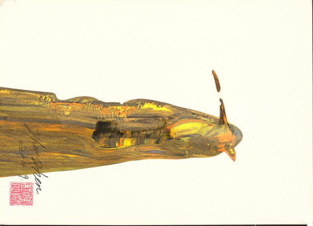 Trace Part Three is a minimalist yet emotive acrylic work on paper by Zhen Zhang, completed in 2016. A single gestural form—vertical, textured, and deeply layered—emerges in tones of ochre, burnt sienna, and black, hovering against a pristine white background. With a solitary, almost calligraphic presence, the figure seems to rise or dissolve, inviting metaphoric interpretation through its simplicity and elegance.