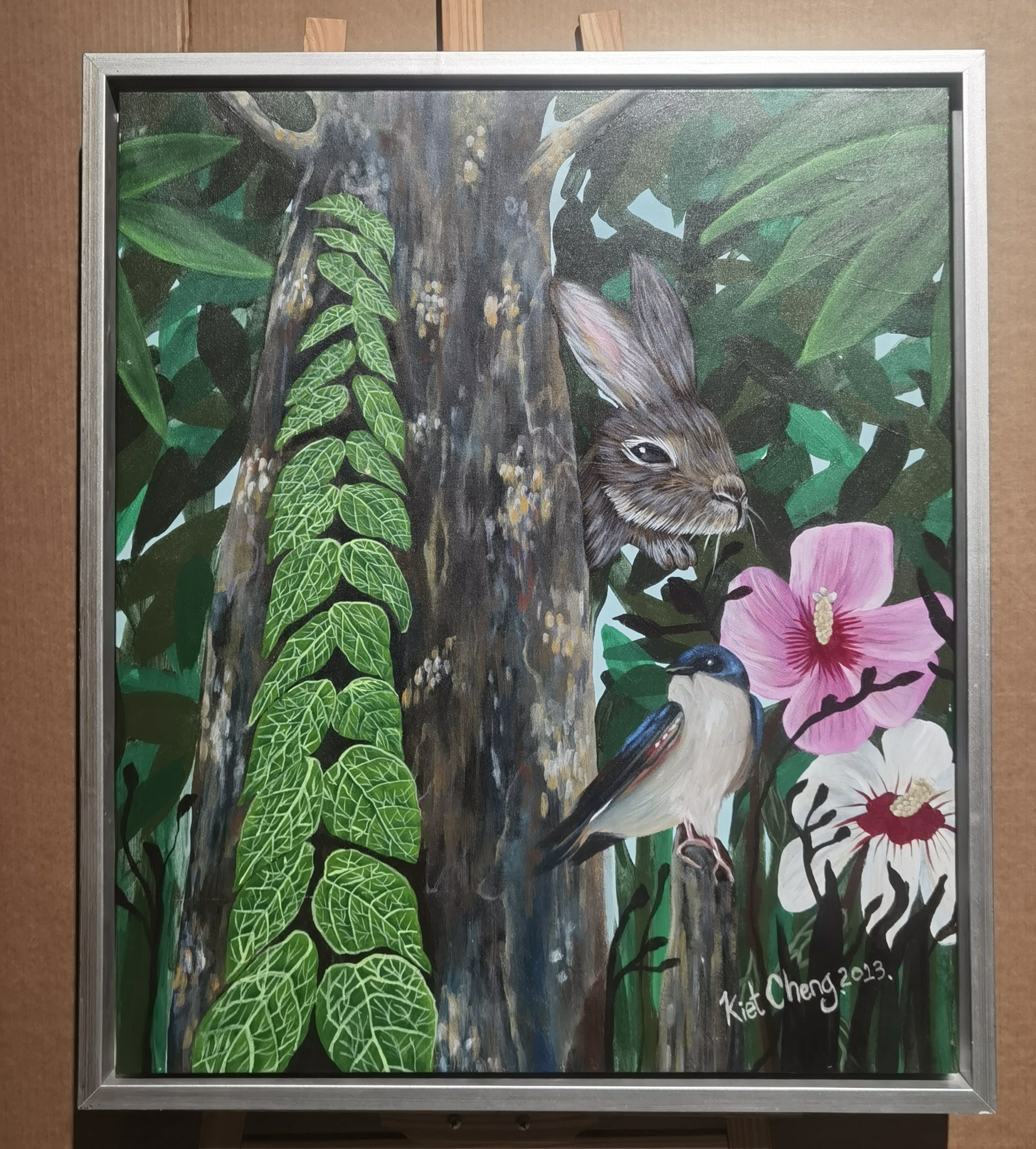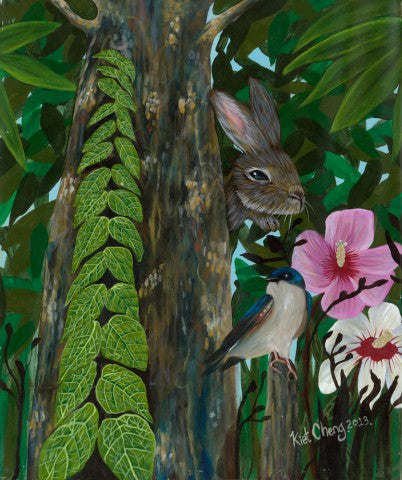In the Jungle 2 is a vibrant and finely detailed acrylic painting by Jiejing Zhang. The scene captures a whimsical yet carefully observed jungle setting, where a rabbit peeks from behind a tree trunk adorned with climbing leaves, sharing the vertical composition with a perched bird and blooming hibiscus flowers. The artist’s signature and date appear on the lower right.