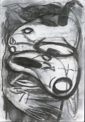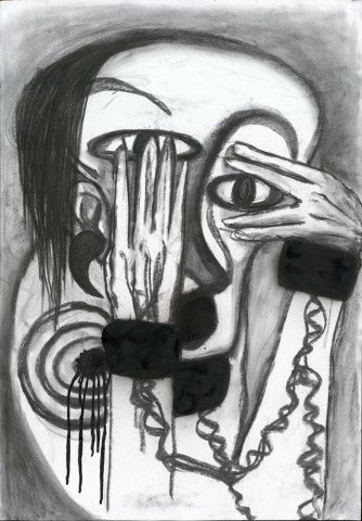 Shout 1 and Shout 2 are expressive oil paintings by Jinglei Nie. The first composition centers on a distorted human-like face partially obscured by hands, invoking tension and psychological unease. The second piece employs gestural, rough-hewn lines forming biomorphic abstractions. Both works suggest deeply emotive states conveyed through dynamic mark-making and strong contrasts.