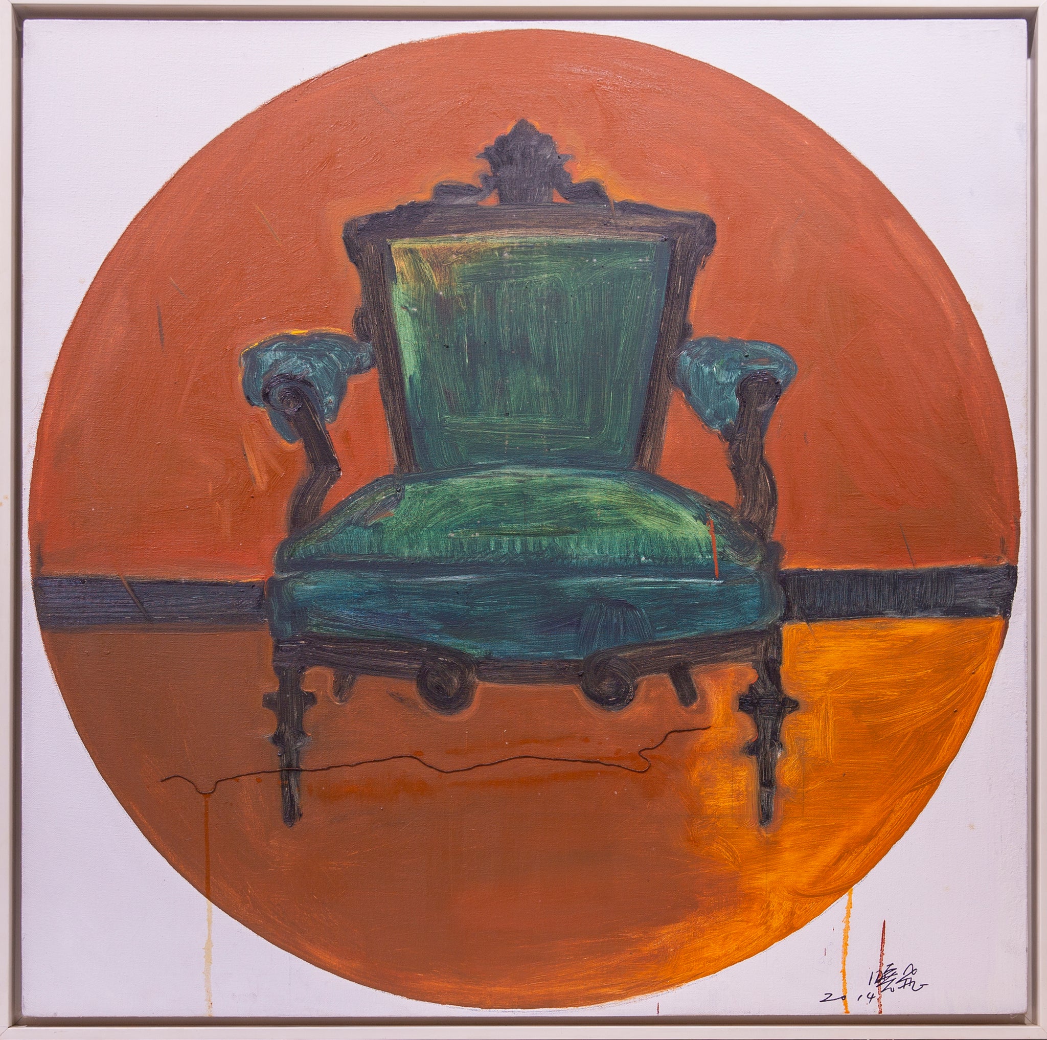 Xiaofei Li’s The Eye of the Other 8 presents an ornate antique armchair, upholstered in rich green fabric with dark wooden detailing, as the focal subject. Positioned within a vivid orange circular backdrop against a white ground, the composition creates a bold interplay of form and color. The strong chromatic contrast draws immediate attention to the chair, transforming it into an object of contemplation rather than mere function.