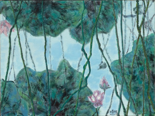 Summer Lotus Series II by Tongcheng Liu is a 60 × 80 cm oil on canvas that captures the tranquil beauty of a lotus pond in midsummer. Dominating the composition are broad, green lotus leaves and delicate pink blossoms rising elegantly above the water’s surface. A dense network of stems and stalks weaves through the scene, creating an almost abstract pattern, while a pale blue backdrop suggests the shimmering presence of sky or reflected light.