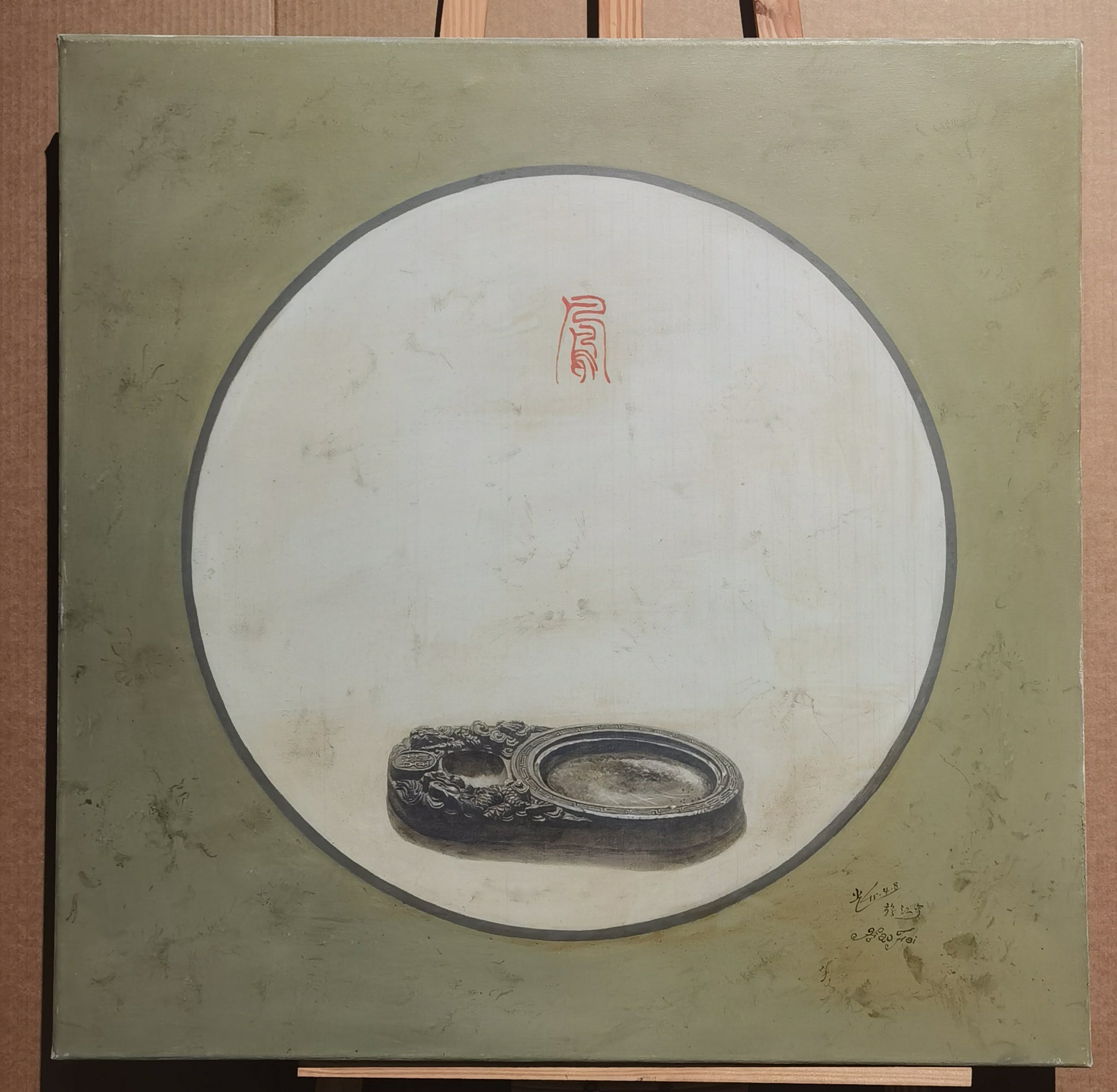 Blending traditional symbolism with contemporary technique, Zhang’s approach demonstrates influences from both classical Chinese decorative arts and modern realist painting. The deep, lustrous blacks, coupled with subtle highlights and ornamental details, evoke the materiality of carved stone while maintaining the vitality of oil pigment. The artist’s fidelity to form and texture reveals a reverence for craftsmanship within a fine art context.