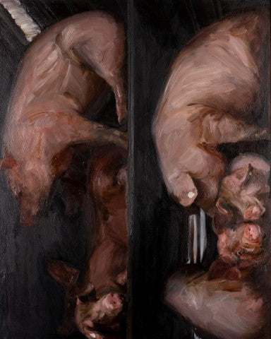 The Cart of Pigs by Shaozhi Bian is an evocative oil painting measuring 95 × 110 cm. The composition portrays pigs confined within a narrow, dimly lit enclosure, visually segmented by a strong horizontal division that bisects the canvas into two distinct planes. This structured division intensifies the sense of confinement, creating a dramatic interplay between form, space, and shadow.