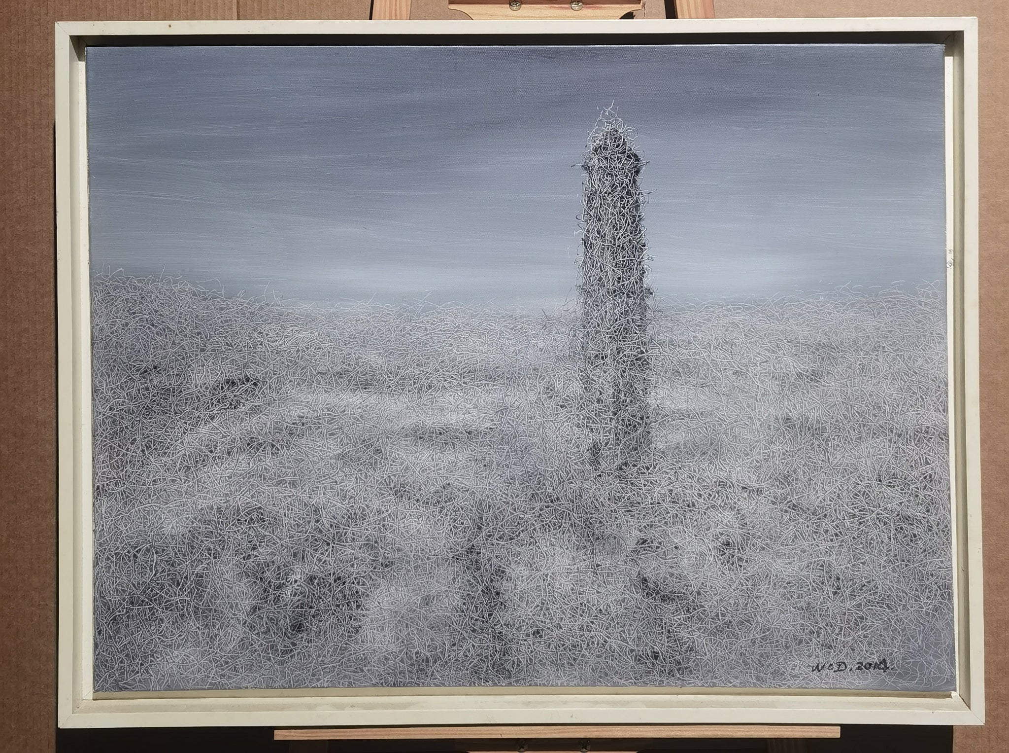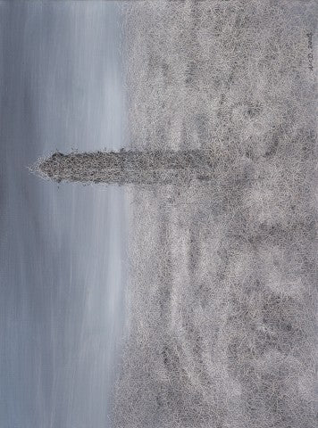 This oil painting from Chengdong Wang’s Gangnam Slice Series (2014) measures 60 by 80 centimeters and presents a striking composition centered around a solitary vertical structure—possibly a tower or obelisk—emerging within a muted, atmospheric landscape. The scene is enveloped in a veil of soft tonal gradients, evoking mist or fog, and the brushwork alternates between structured and diffuse passages, heightening the sense of isolation and spatial ambiguity.
