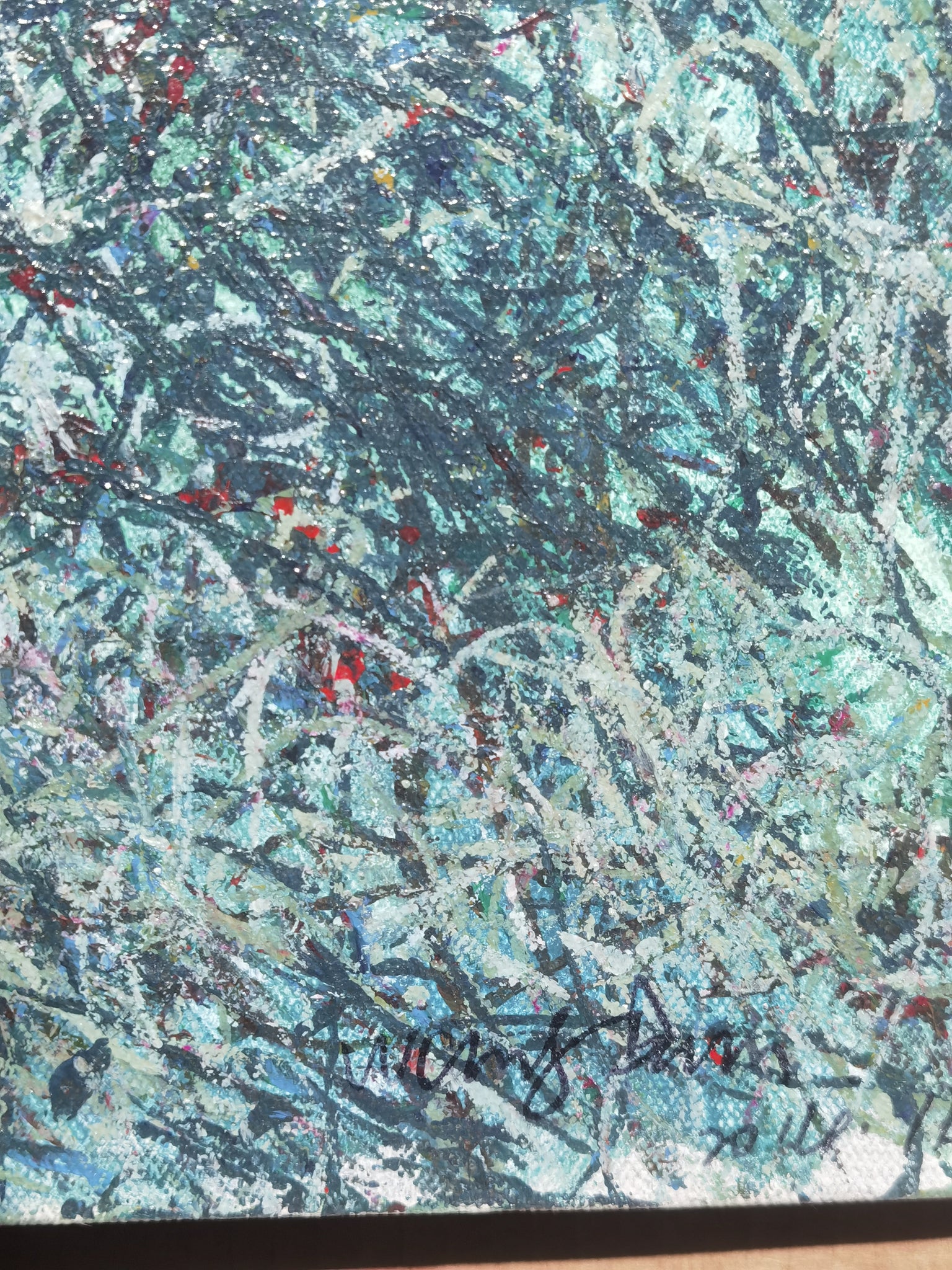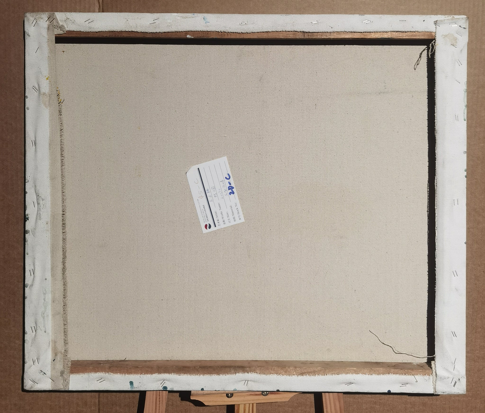 The artwork is in very good condition. The acrylic layers remain vibrant and stable with no evidence of flaking, loss, or restoration. The canvas is taut and well-preserved, and the textured surface maintains its original complexity and color depth. Ready for display.