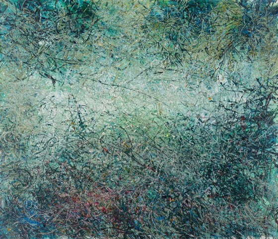 Wang’s technique blends abstract expressionist energy with tactile materiality. Employing gestural brushwork and impasto surfaces, Dry Up resonates with the influence of artists such as Cy Twombly and Zao Wou-Ki, where form dissolves into an all-over field of emotional intensity. The dense network of linear forms suggests both natural growth and entropic unraveling—an interplay between creation and decay that is central to the artist’s conceptual vocabulary.