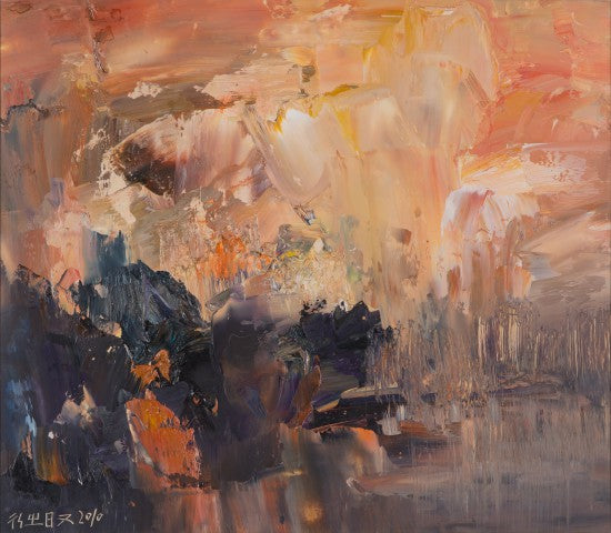 Painted in 2010, this work emerges during a period when Chinese painters increasingly explored hybrid vocabularies, merging Western modernist aesthetics with indigenous landscape traditions. Chen’s abstraction of natural scenery reflects this dialogue, transforming a familiar motif—the mountain at sunset—into a meditative exercise on color, form, and perception.