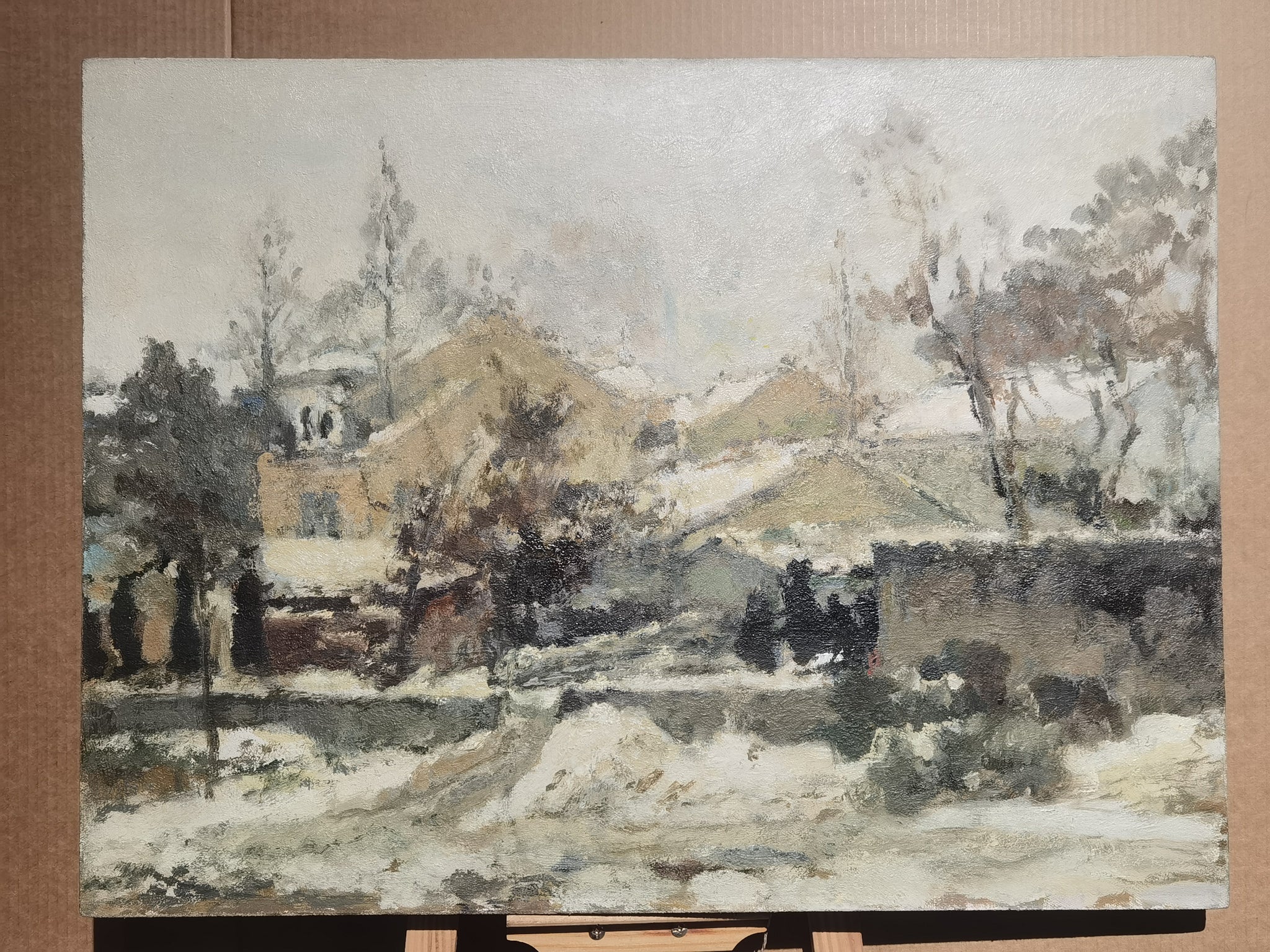 The painting reflects an Impressionistic sensibility, emphasizing natural light and the subtle shifts of color in snow-covered landscapes. Hu’s technique balances detail with softness, echoing the influence of French Impressionists who sought to capture fleeting moments in nature. The work also aligns with contemporary explorations of European rural scenes by Chinese artists.
