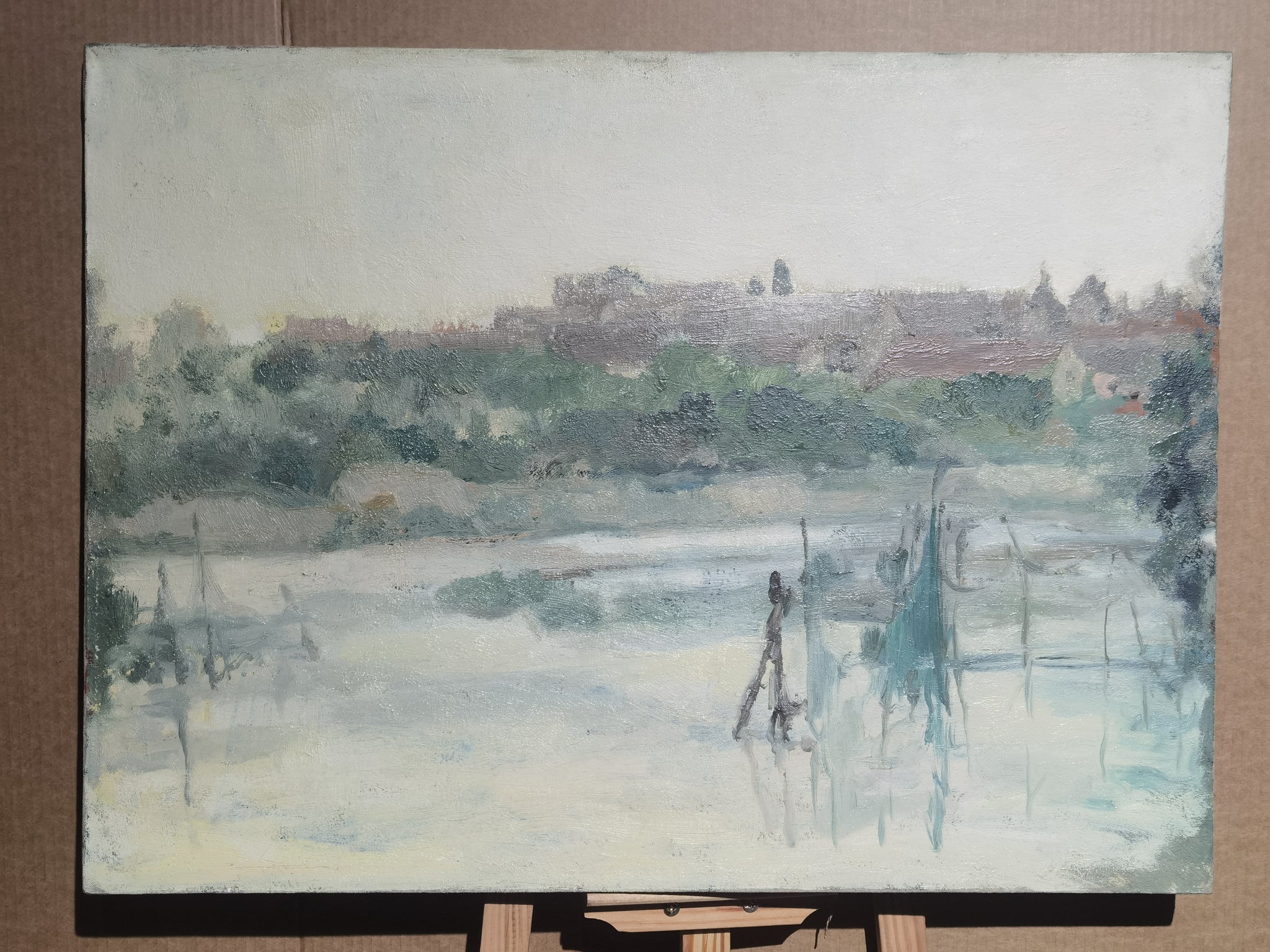 Untitled Two by Xueqing Hu is an evocative oil painting portraying a serene landscape centered around a body of water, framed by distant structures and clusters of trees. The composition captures an atmospheric moment, rendered through visible, expressive brushstrokes that bring texture and life to the scene.