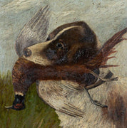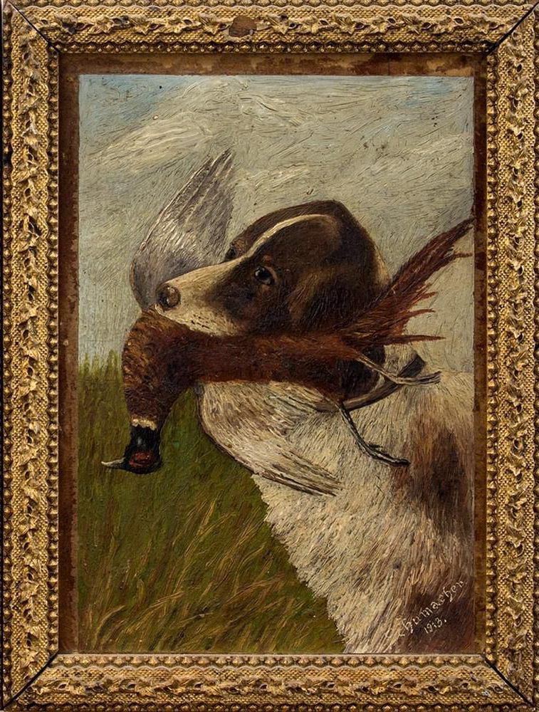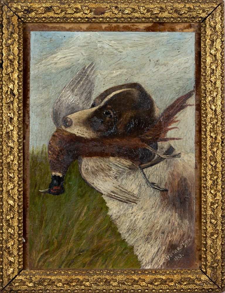 This exquisite artwork by the 20th-century hunting painter Schumacher captures a captivating scene of the hunt. A skilled hand has expertly rendered the moment when a hunting hound, caught in mid-action, proudly presents a captured bird in its mouth. The attention to detail is remarkable, as every brushstroke seems to convey the energy and excitement of the chase.