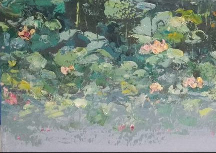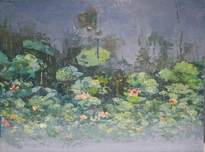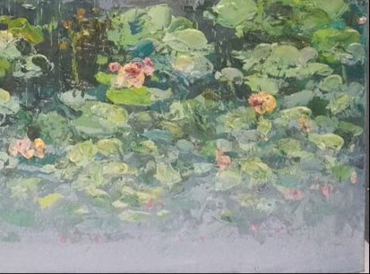 "Lotus 3" by Wei Luning is a stunning oil painting that captures the delicate beauty and tranquility of lotus flowers in full bloom. The artist employs a rich color palette and expressive brushstrokes to create depth and movement, bringing the scene to life. The gentle ripples in the water reflect the elegance of the blossoms, evoking a sense of harmony and serenity. This piece is a celebration of nature’s purity and grace, making it a captivating addition to any collection.
