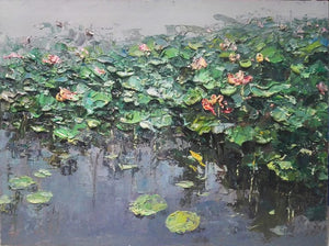 "Lotus 4" by Wei Luning is a captivating oil painting that beautifully portrays the elegance of lotus flowers in bloom. The artist’s use of soft brushstrokes and rich hues creates a serene atmosphere, capturing the tranquil essence of the lotus in its natural setting. The fluidity of the water and the graceful positioning of the flowers draw the viewer into a peaceful, meditative world. This piece reflects the timeless beauty and spiritual symbolism of the lotus in Chinese culture.