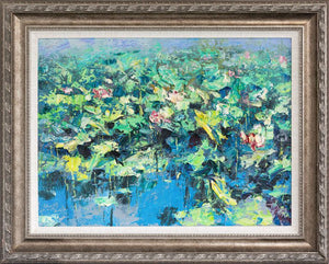 Wei Luning s "Rhyme 1" is a captivating oil painting that immerses viewers in the serenity of a water lily-filled pond. This artwork presents a complex and vibrant visual tapestry, where intricate vegetal elements intermingle with the dynamic reflections dancing on the water s surface. Rather than meticulously detailing each element, Wei Luning opts for a more abstract and impressionistic approach, transforming this piece into a study of color and light.