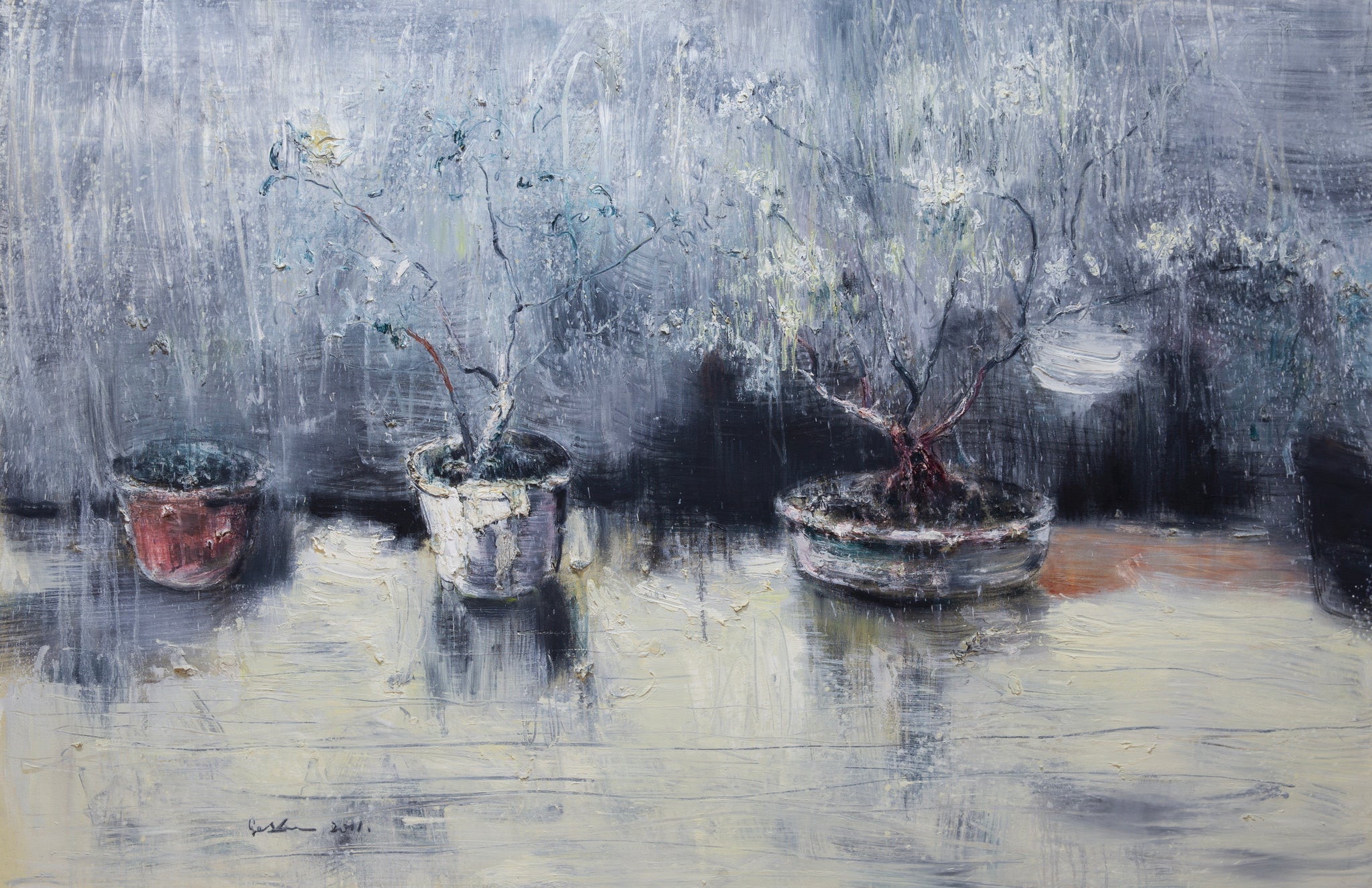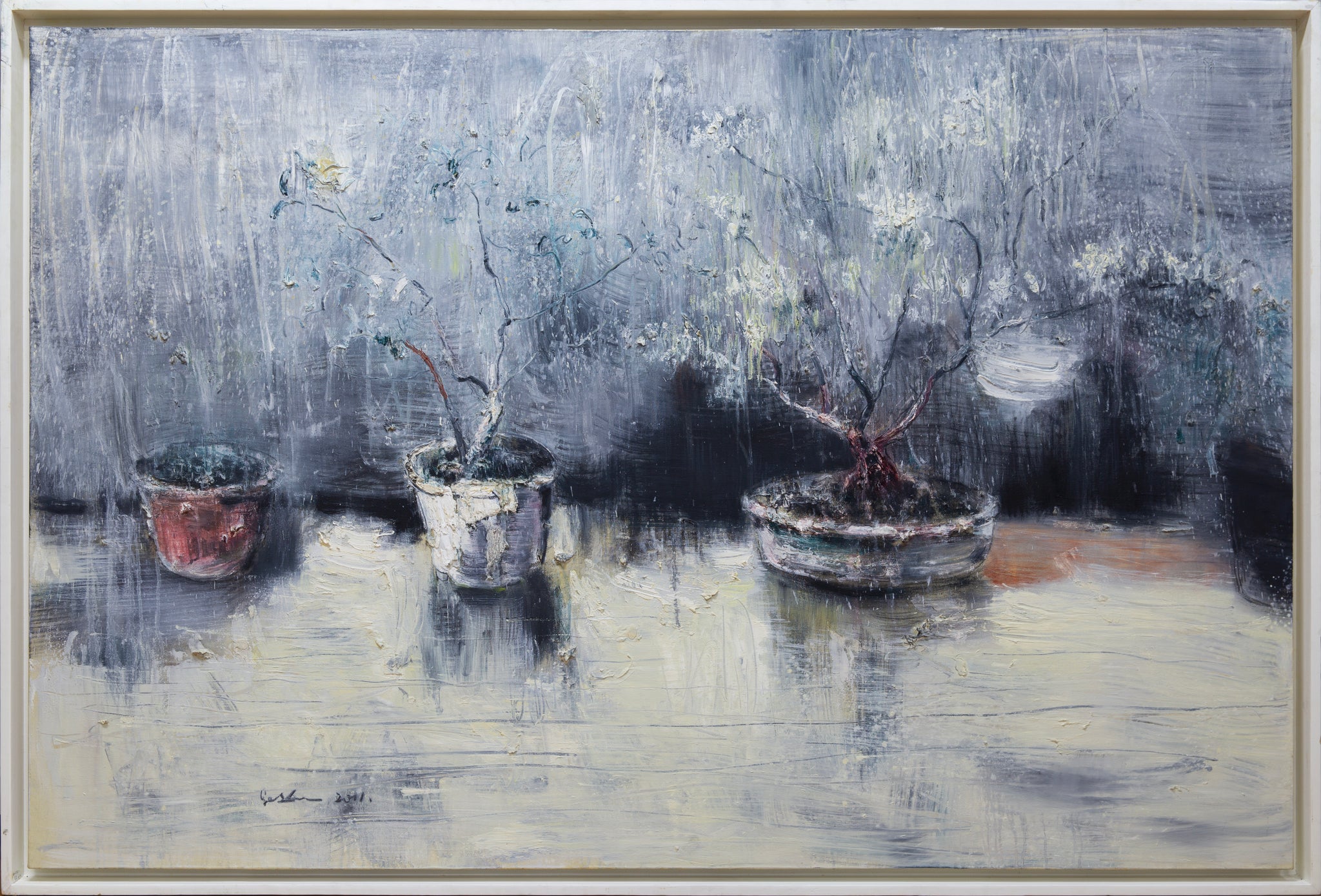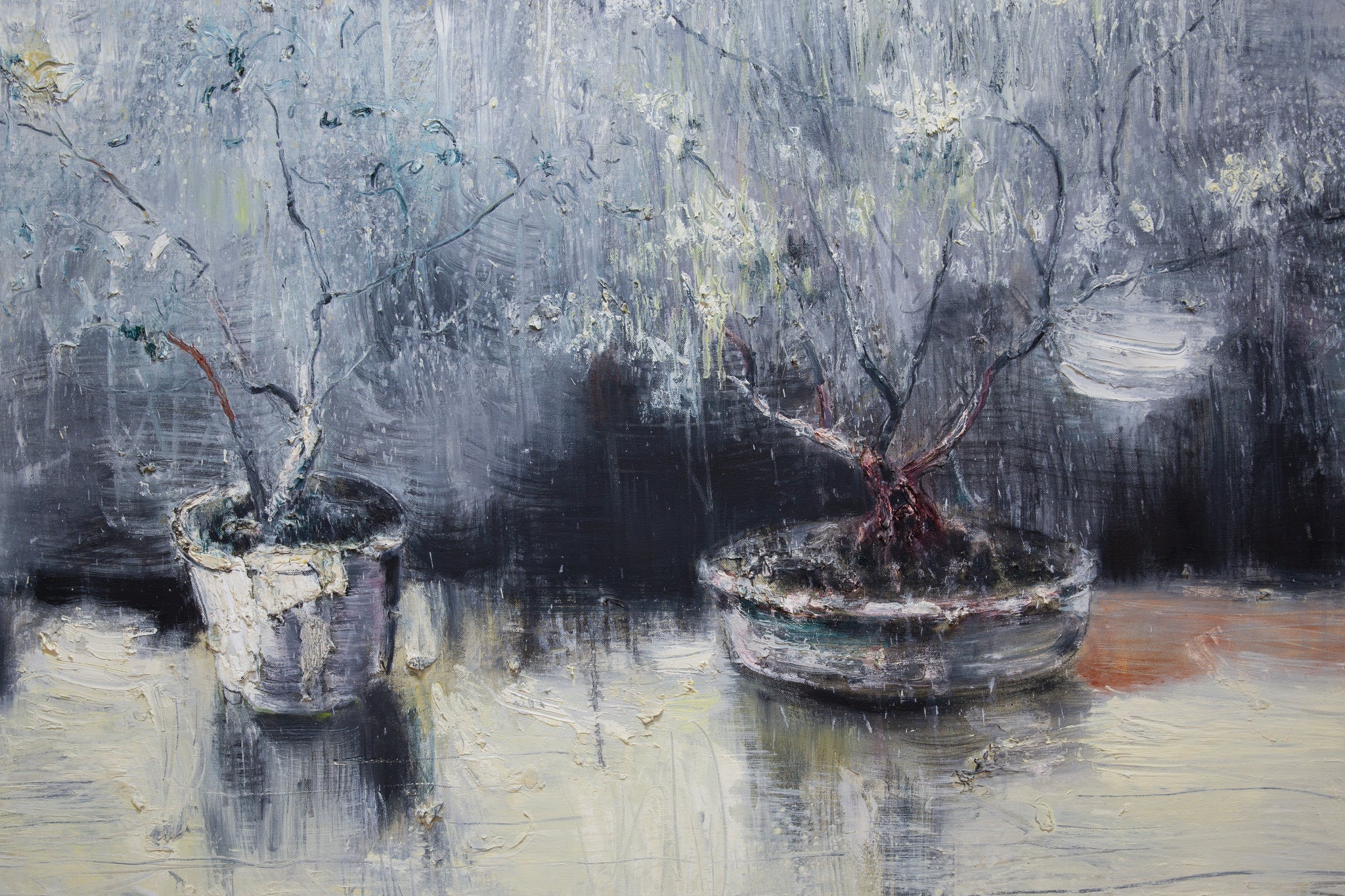 Back Garden by contemporary artist Zhen Ge is a substantial oil on canvas measuring 140 by 180 centimeters. The composition centers on three pots containing plants, rendered in a muted, restrained palette dominated by greyish, brown, and black tones. The limited color scheme evokes a contemplative and subdued atmosphere, inviting close inspection of texture and form.