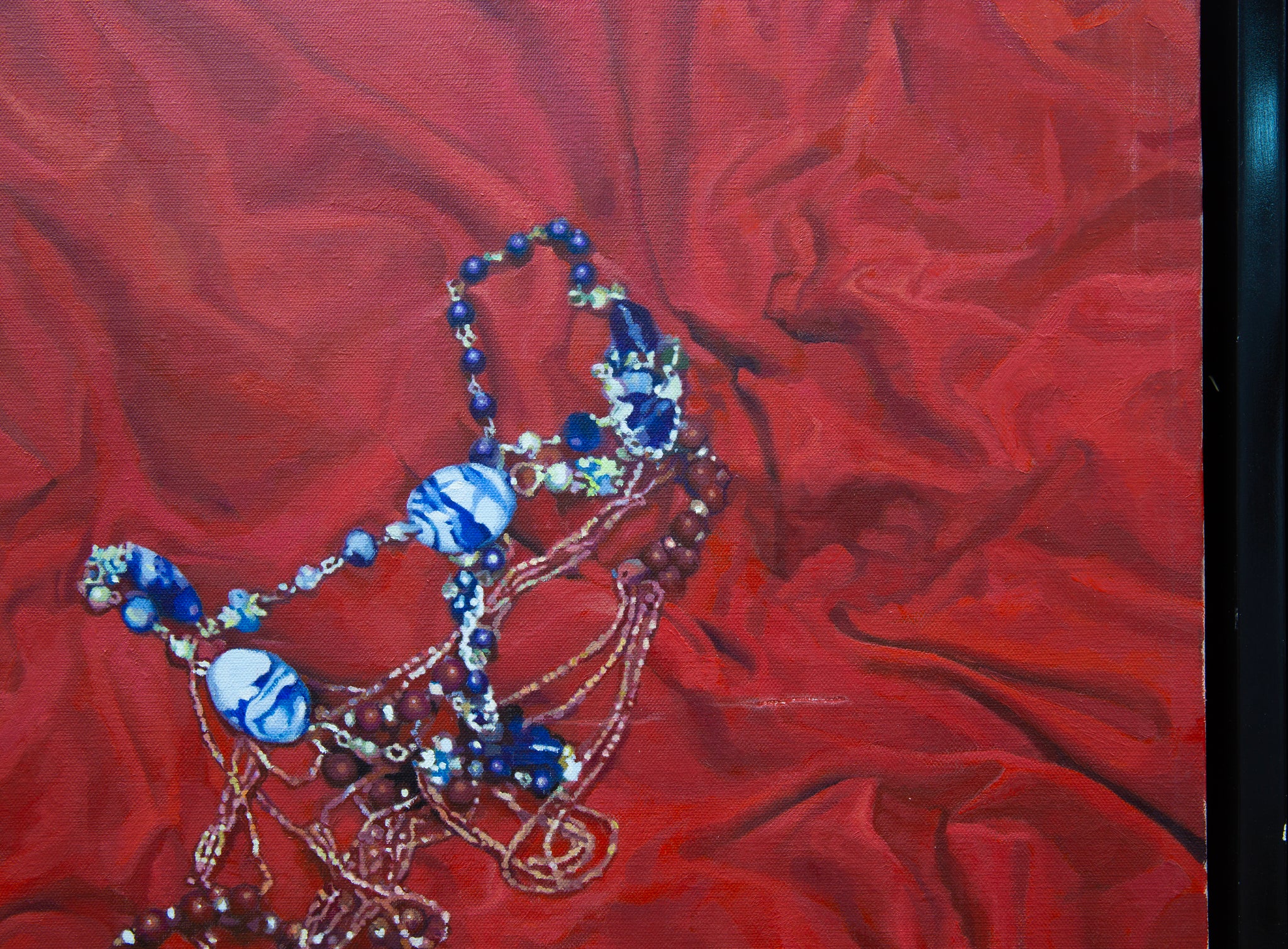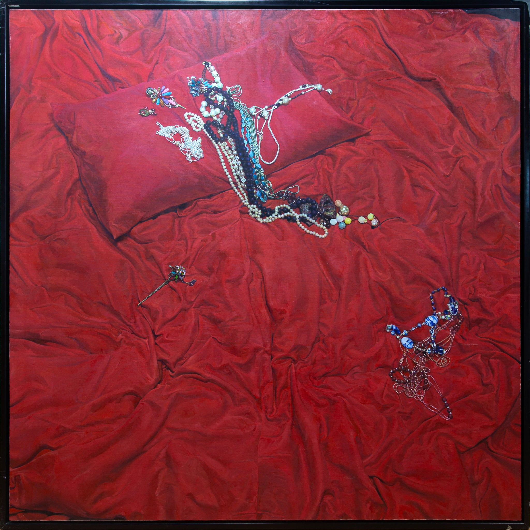 Wang’s work sits at the crossroads of hyperrealism and symbolic expressionism. His meticulous rendering of textures—silk, metal, and gem—demonstrates a mastery of surface illusion, while the saturated palette and deliberate placement of objects suggest emotional depth and narrative intention. This painting draws conceptual influence from vanitas traditions and the visual language of romantic symbolism. The bed becomes a psychological space, the red color echoing both desire and memory, while the jewelry may signify longing, loss, or the remnants of intimacy.