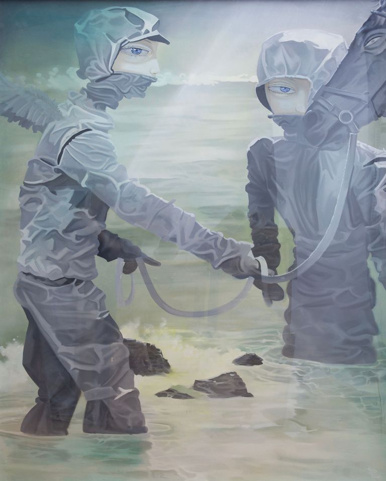 Transparent Beach is a compelling oil on canvas by Yu Xiong, measuring 150 by 120 centimeters. The composition showcases his distinctive blend of classical painting techniques infused with contemporary pop culture elements. Featuring surreal, ethereal figures and vivid, dreamlike colors, the work embodies a unique visual language that navigates between reality and imagination, evoking a poetic sense of the virtual and symbolic.