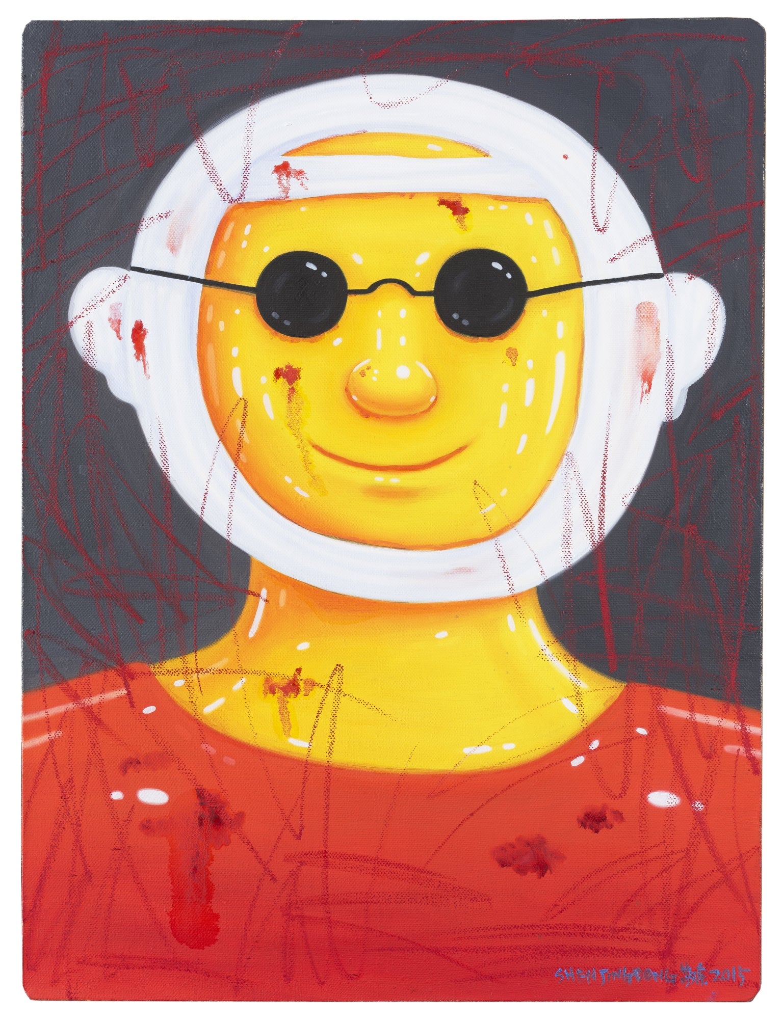 The Man Wearing Sunglasses presents a stylized, cartoon-like figure rendered in vibrant hues of yellow, red, and white, marked by Shen Jingdong's unmistakable aesthetic. The subject’s smooth, almost plasticized skin and fixed smile evoke the artificiality of commercial iconography, while the round black glasses and simplified facial forms hint at anonymity and mass-produced identity. Overlaid red scribbles introduce a layer of tension, disrupting the otherwise polished composition and suggesting underlying critique.