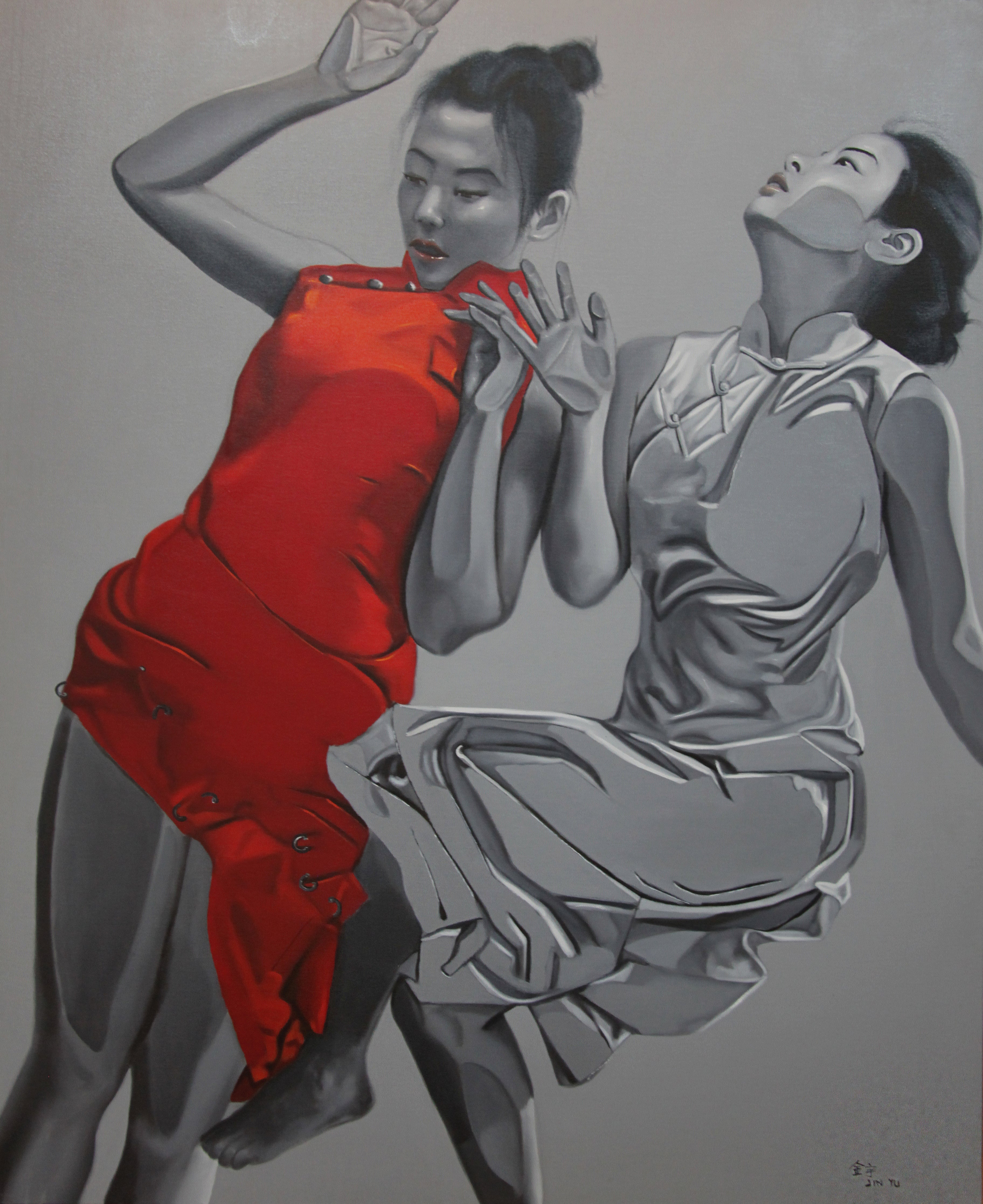 In 401 of the Contact, Jin Yu masterfully depicts two female figures frozen in a moment of expressive movement, one rendered in grayscale and the other in vibrant red. The interplay of stillness and motion, contrast and harmony, captures the dualities of human emotion and identity. The figures’ dynamic poses and intricate garments evoke a narrative of internal dialogue or cultural tension, inviting the viewer into a complex visual choreography.