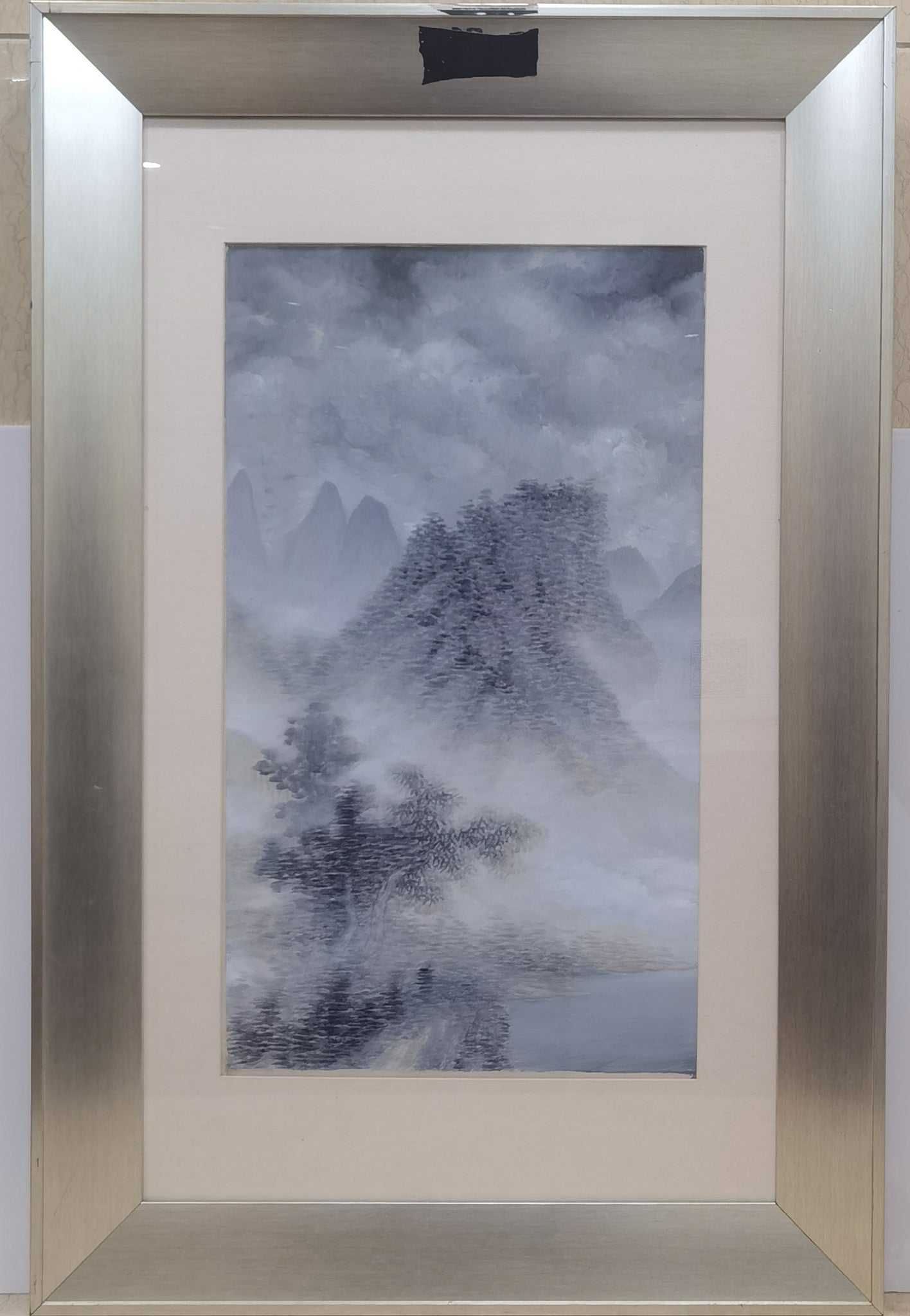 This serene oil painting by Gao Huijun, Title:d Sketch 4, presents an ethereal mountain landscape shrouded in mist. Executed in subdued monochromatic tones, the work captures the quiet majesty of nature through intricate brushwork and tonal depth. The painting is elegantly framed, emphasizing its contemplative atmosphere.