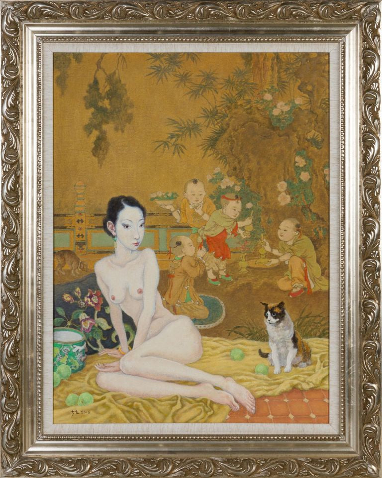 This richly detailed oil painting by Shaoli Chen, One of the Baby Play Pictures, presents a striking juxtaposition between classical Chinese court painting motifs and contemporary figuration. At the heart of the composition lies a sensuous, modern nude woman seated on patterned silk, accompanied by a vigilant cat, while a group of traditional Chinese children—rendered in the style of Ming or Qing dynasty decorative paintings—engages in playful rituals in the background. The work is a sophisticated orchestration of spatial layering, historical references, and stylistic contrast.