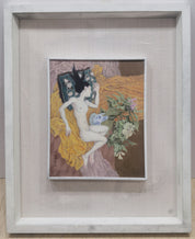 In Human Skit Part 3, Shaoli Chen presents a reclining nude woman rendered in a delicate, almost diaphanous light. She lies atop richly colored textiles in saffron and mauve, surrounded by botanical elements and a traditional porcelain vase filled with cascading blossoms. The compact format enhances the sense of intimacy, while the composition maintains Chen's hallmark blend of sensuality and symbolic elegance.