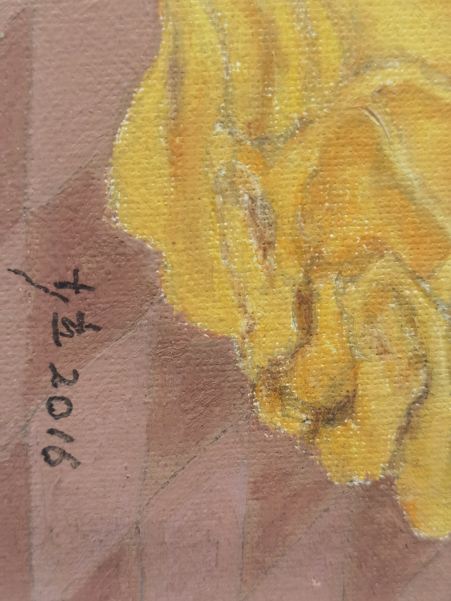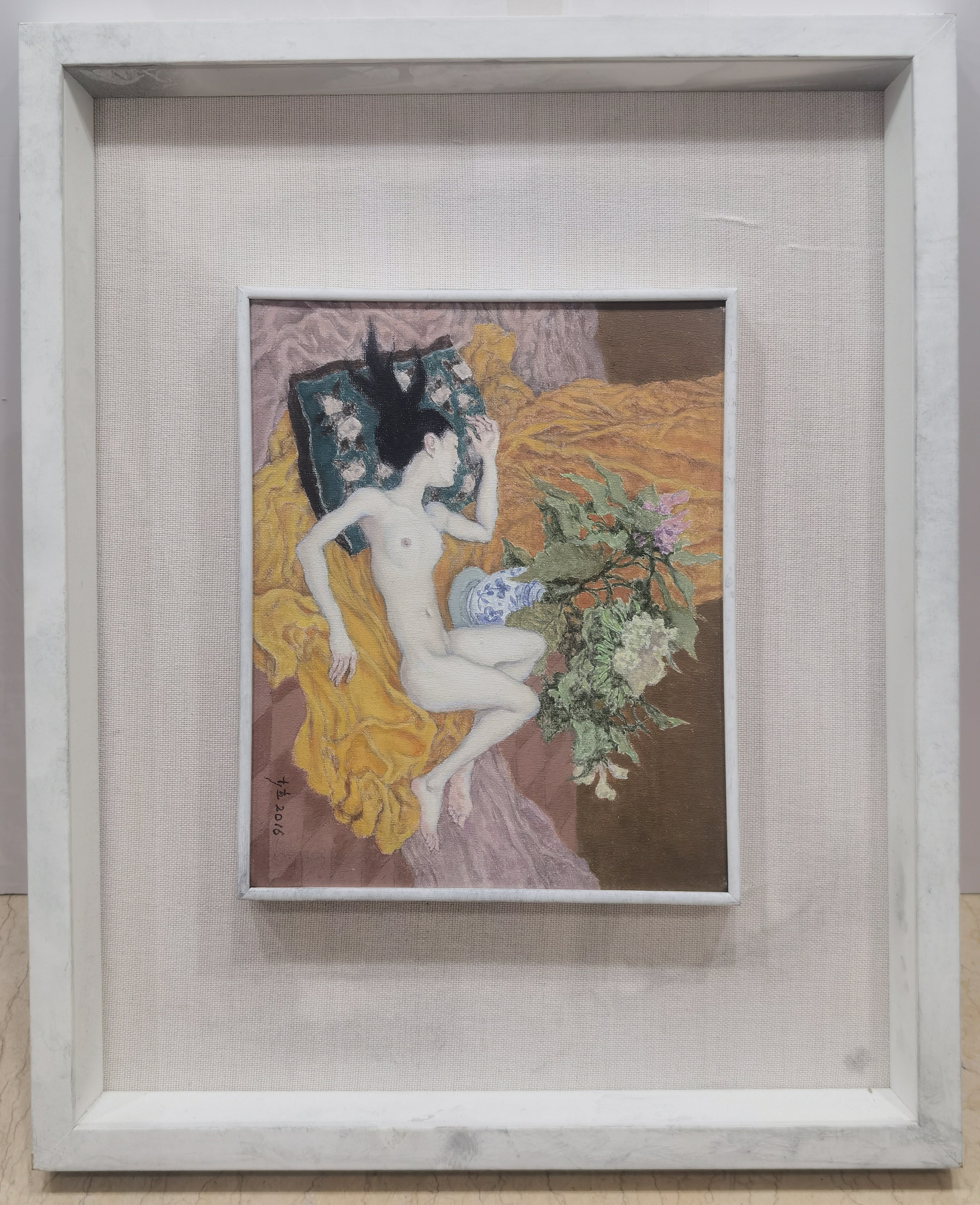 This piece draws heavily from Chen’s distinctive synthesis of classical Chinese decorative arts and European figurative painting. The flattened perspective and floral arrangements reference traditional Chinese painting scrolls, while the anatomical precision and soft modeling of the figure evoke Renaissance influences. The visual contrast between vibrant fabric folds and the still repose of the body deepens the painter’s exploration of aesthetic and cultural tension.