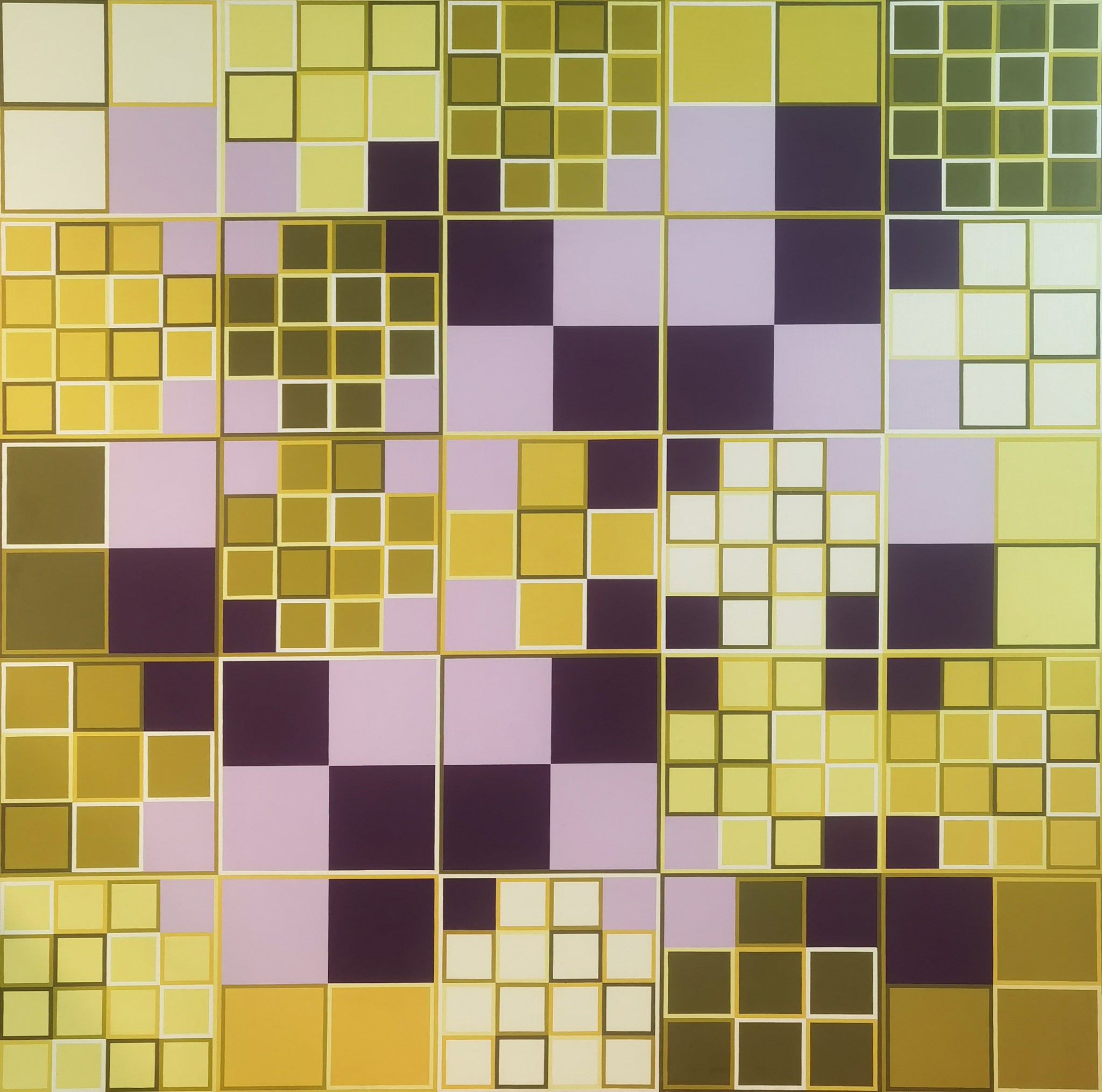 Double Symmetry is a striking geometric abstraction composed of systematically arranged squares and rectangles in a palette of ochre, lavender, ivory, and deep plum. The grid-based design employs proportional logic and rhythmic variation to create a visually engaging dialogue between order and complexity.