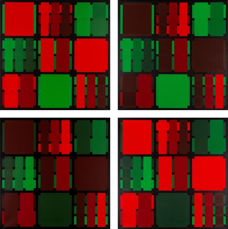 This suite exemplifies Kallhardt’s allegiance to the Concrete Art movement, drawing upon the lineage of geometric abstraction and systematic composition. His use of pure color and formal repetition invites comparison to the optical investigations of Victor Vasarely and the conceptual clarity of artists such as Max Bill. The chromatic contrast between vibrant reds and vivid greens is intensified by a matrix of black grid-like divisions, lending the compositions a rhythmic and almost musical sensibility.