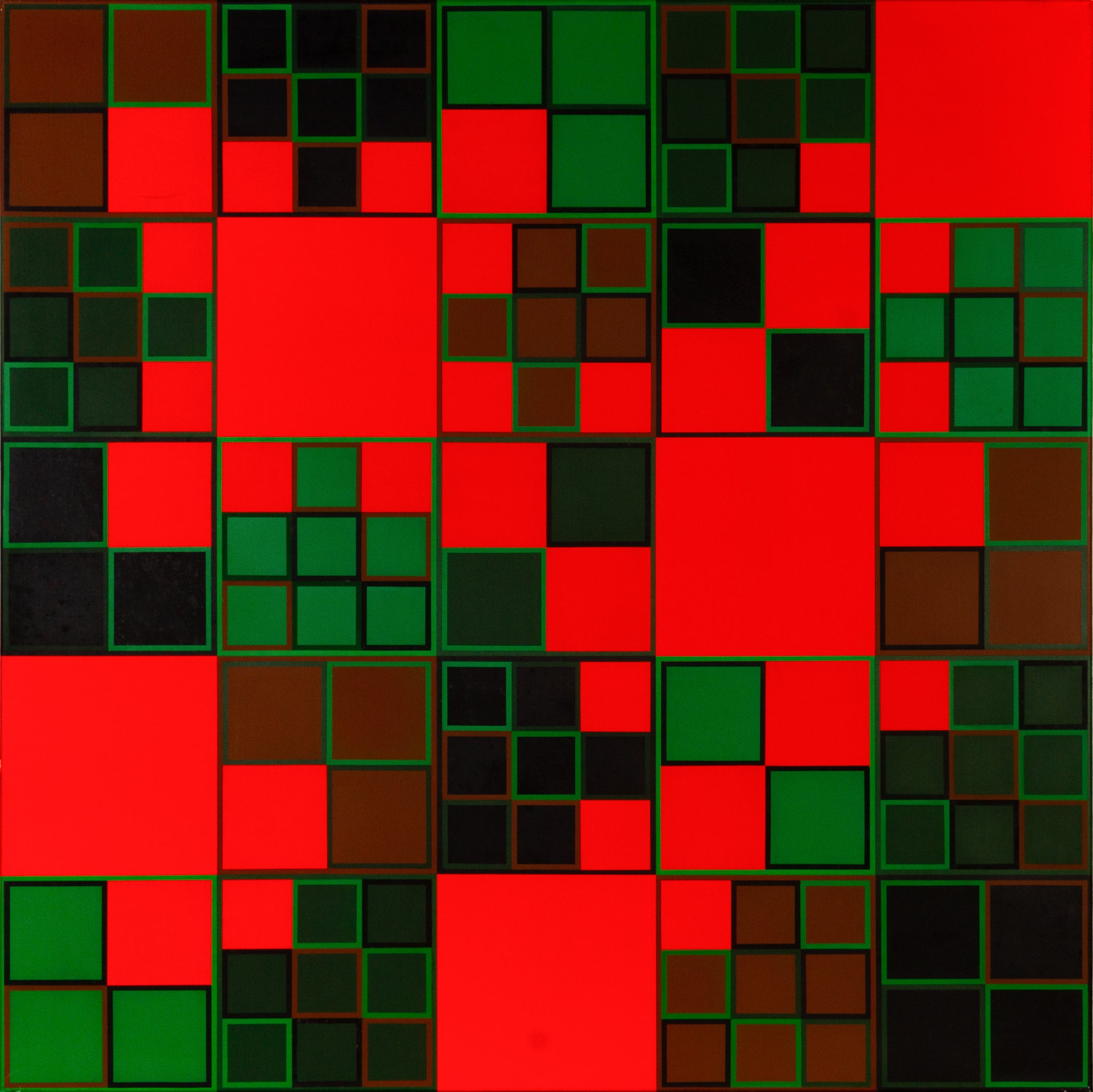 Reiner Kallhardt’s Tanz der Vampire in Babylon 2003 (nr. 5, version 2) is a vivid, large-scale oil painting composed of modular squares and rectangles rendered in saturated red, green, and earthy brown hues. Executed in 2003, the work measures 120 x 120 cm and features Kallhardt’s hallmark grid-based structure, meticulously ordered yet visually dynamic. The composition engages the viewer with a dance of shifting forms and alternating spatial rhythms, guided by the artist’s masterful chromatic sequencing.