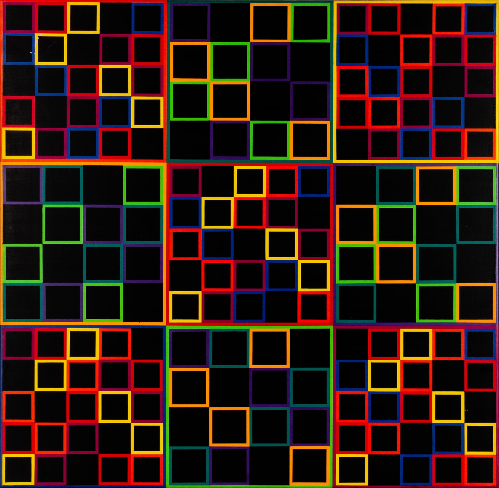Reiner Kallhardt’s Dialektische Komposition 4–5 in 9 is a vibrant geometric oil painting executed on a square canvas measuring 80 x 80 cm. The composition is based on a rigorous grid of nine modules, each containing colorful outlined squares of varying densities against a stark black background. The interplay of hues—ranging from deep red to vivid yellow, green, and blue—creates a rhythmic, almost musical visual cadence, with chromatic shifts echoing across the structural matrix.
