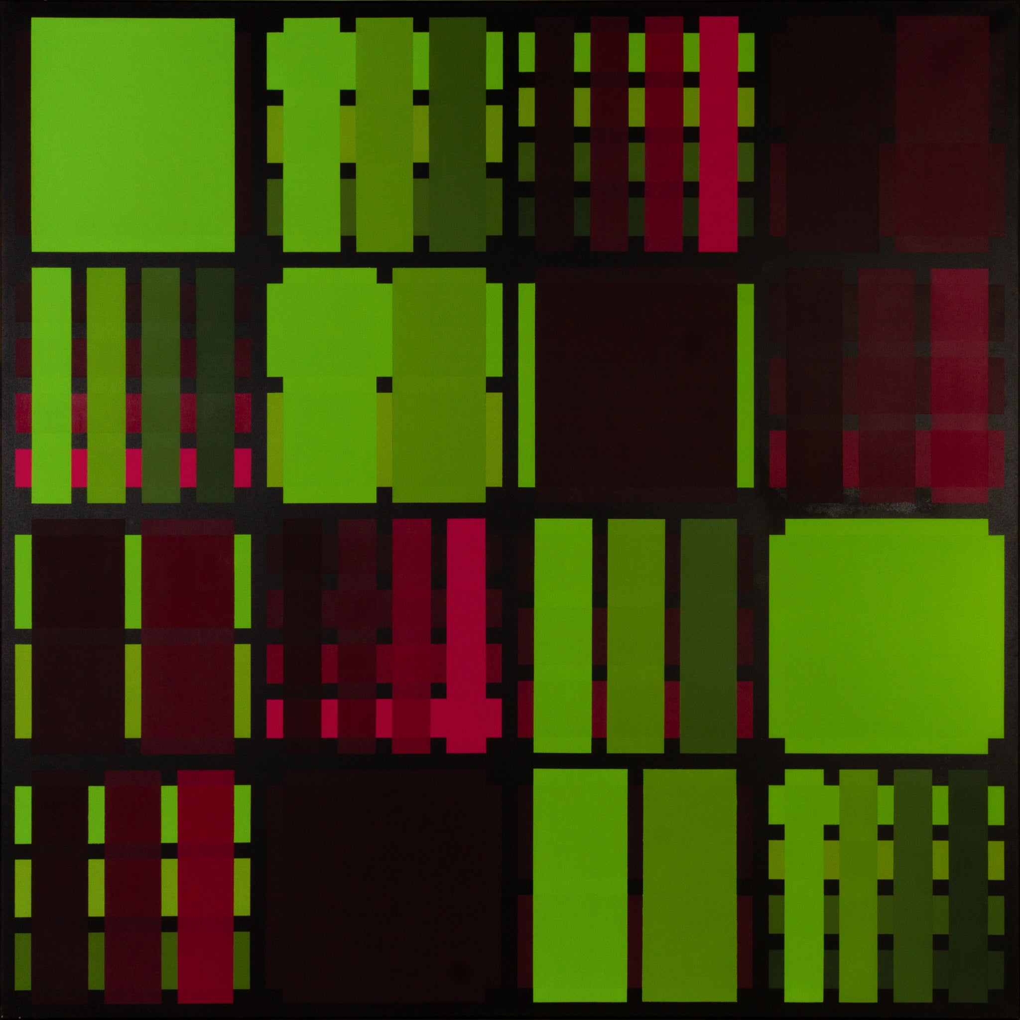 Chromatische Kreuze 16 grh/rd1 is a striking large-format oil painting by Reiner Kallhardt, created in 2013. The composition is built upon a meticulously gridded structure of intersecting squares and bars, rendered in a sharply contrasting palette of chromatic green and crimson red tones. The painting’s surface oscillates between crisp solid fields and densely layered linear patterns, offering a sense of depth and optical complexity that reflects Kallhardt’s enduring fascination with color systems and geometric clarity.