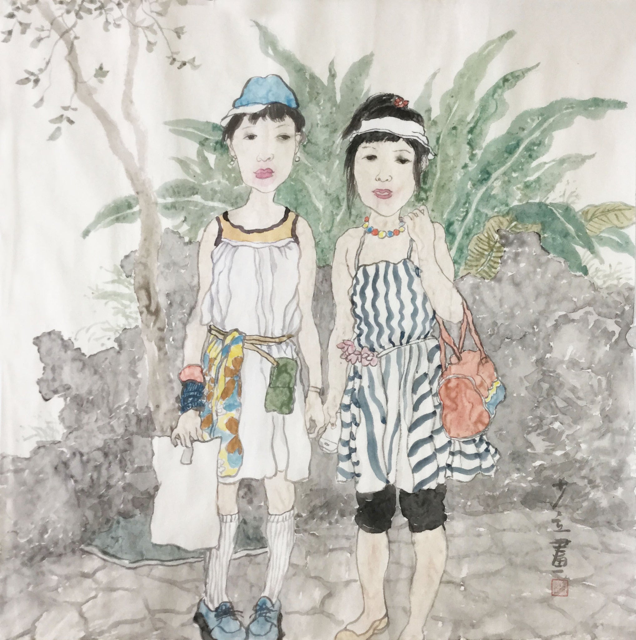 In Girl, Shaoli Chen presents a pair of young girls standing hand in hand before a backdrop of tropical foliage and stone. Their confident postures and fashionable outfits reflect a modern, playful sensibility. Executed with fine linework and delicate watercolor washes, the piece seamlessly marries traditional Chinese artistic discipline with a contemporary, almost narrative-like figuration.