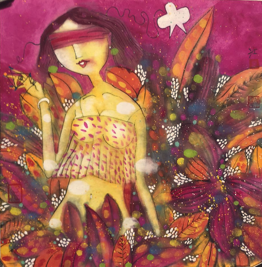 This striking composition by Lv Jiang presents a stylized female figure enveloped in an exuberant field of abstracted foliage. The woman’s blindfolded eyes and whimsical expression evoke themes of innocence, concealment, and playful mystery. Executed in ink and watercolor, Girl is a bold and expressive work, its square format emphasizing balance and containment within an otherwise chaotic, dreamlike natural world.