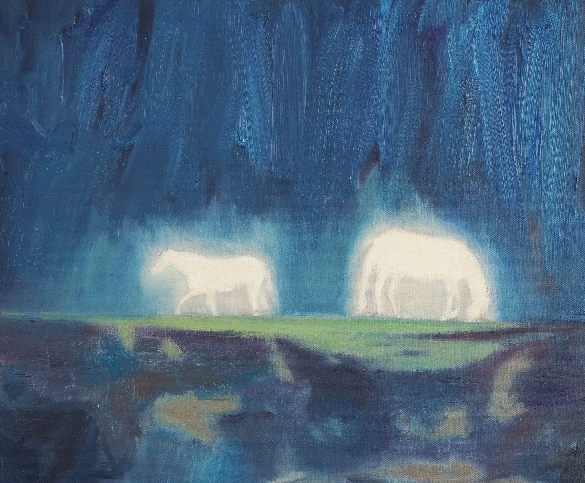 This ethereal oil painting by Sun Yan, presented without a Title:, features two luminous white horses standing against a deep ultramarine-blue backdrop. The horses are rendered in a ghostly, glowing aura that diffuses softly into the surrounding atmosphere, creating a dreamlike tension between figure and void. Executed in oils on canvas, the work measures 50 by 60 centimeters and is characterized by fluid, expressive brushstrokes and a deliberately hazy resolution.
